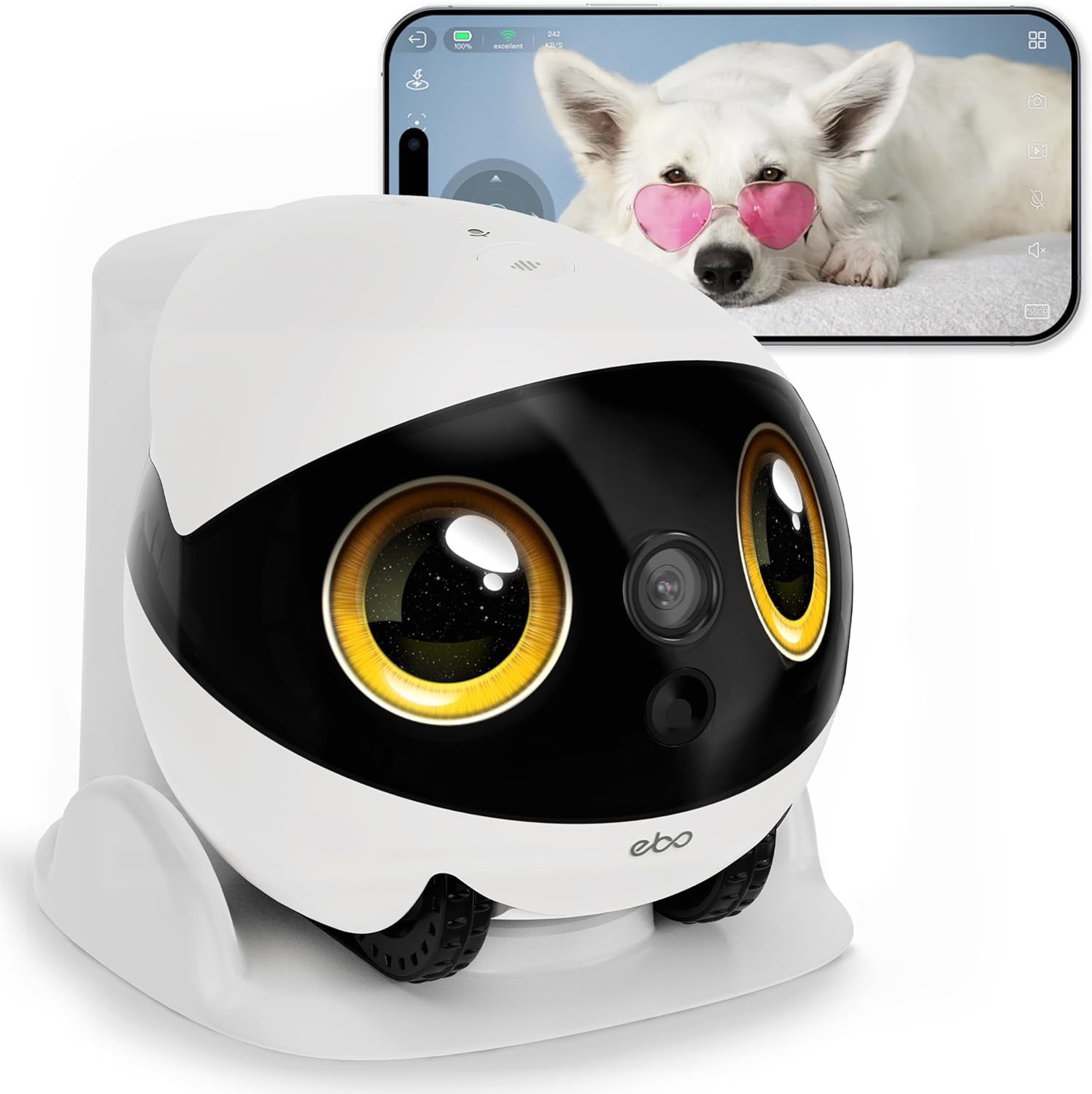 ​​MOVABLE ROBOT WITH 2.5K CAMERA:​​ Drive EBO home camera robot around your home with a simple tap. Glide smoothly on tracked wheels to join a family celebration from afar or keep a loving eye on your napping pet, all in stunning 2.5K clarity—day or night