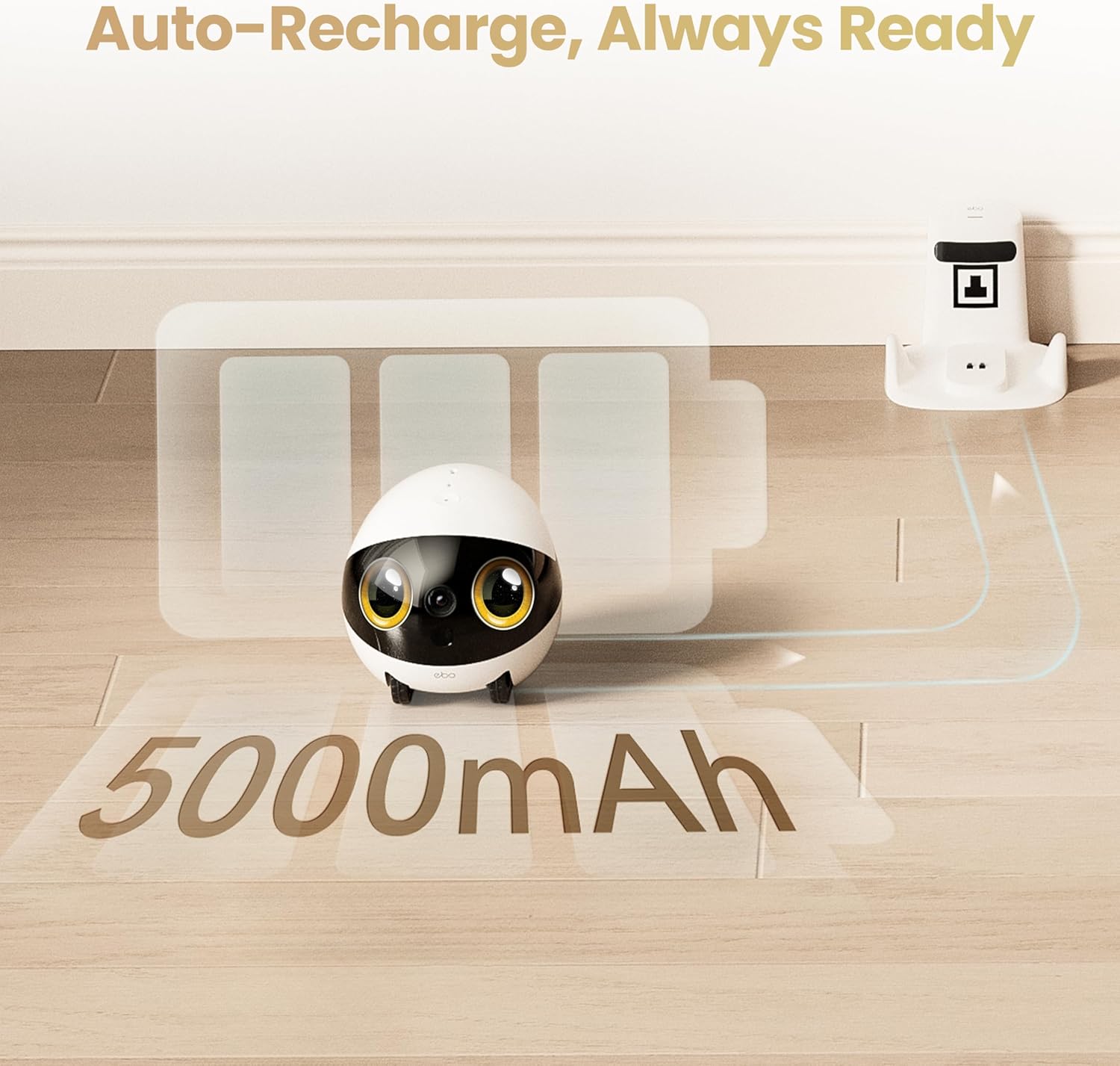AUTO-RECHARGE & LONG-LASTING BATTERY:​​ Miss someone at home? EBO is ready whenever you are. The long-lasting battery ensures you can drop in for a spontaneous visit, and with auto-recharge, it’s always powered up and waiting