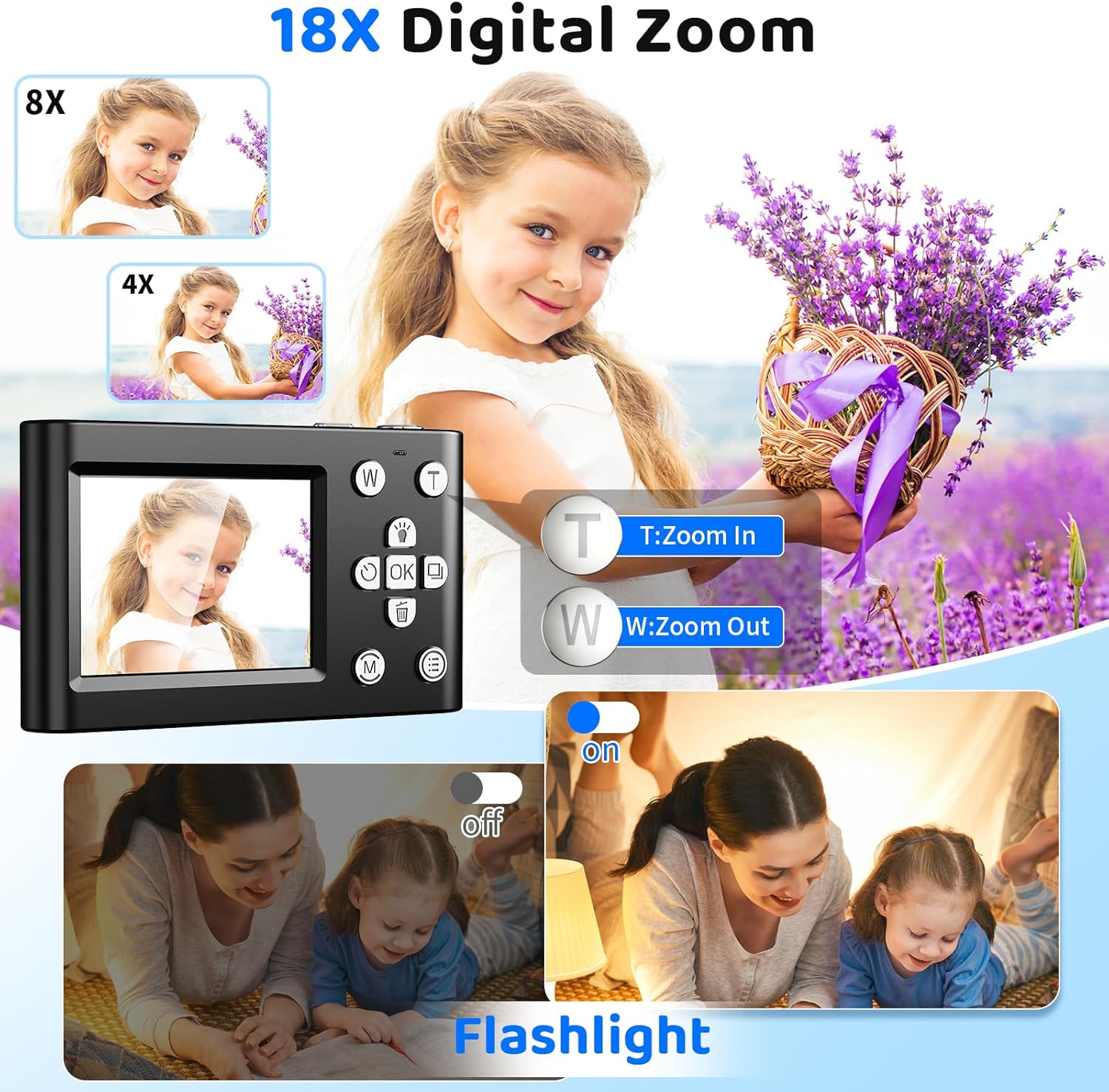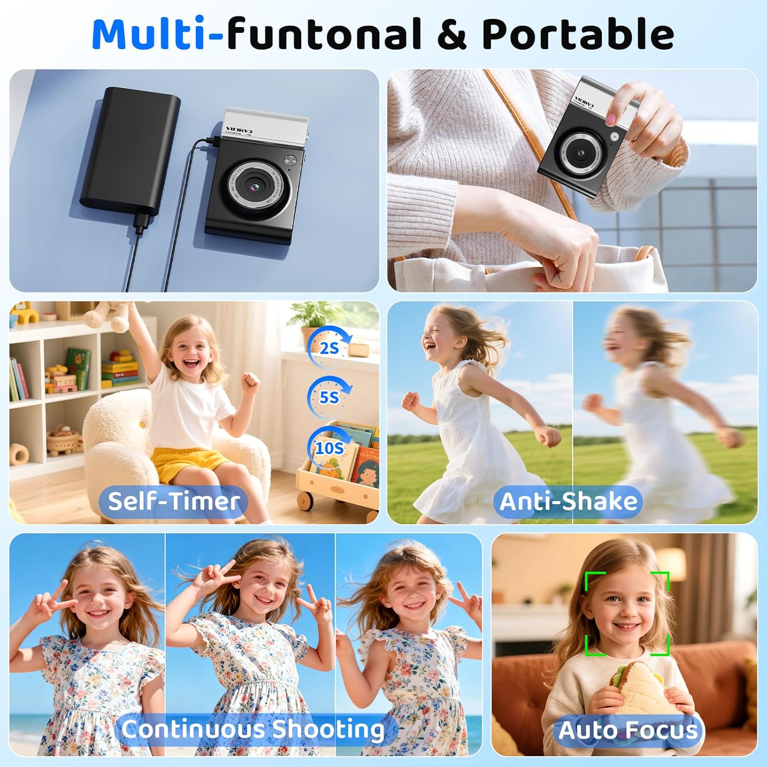 👧 【Easy to Use & Perfect for Kids】With auto focus, anti-shake, 18X digital zoom, burst mode, and self-timer (3/5/10s), this camera helps kids capture clear, fun photos and videos with ease.