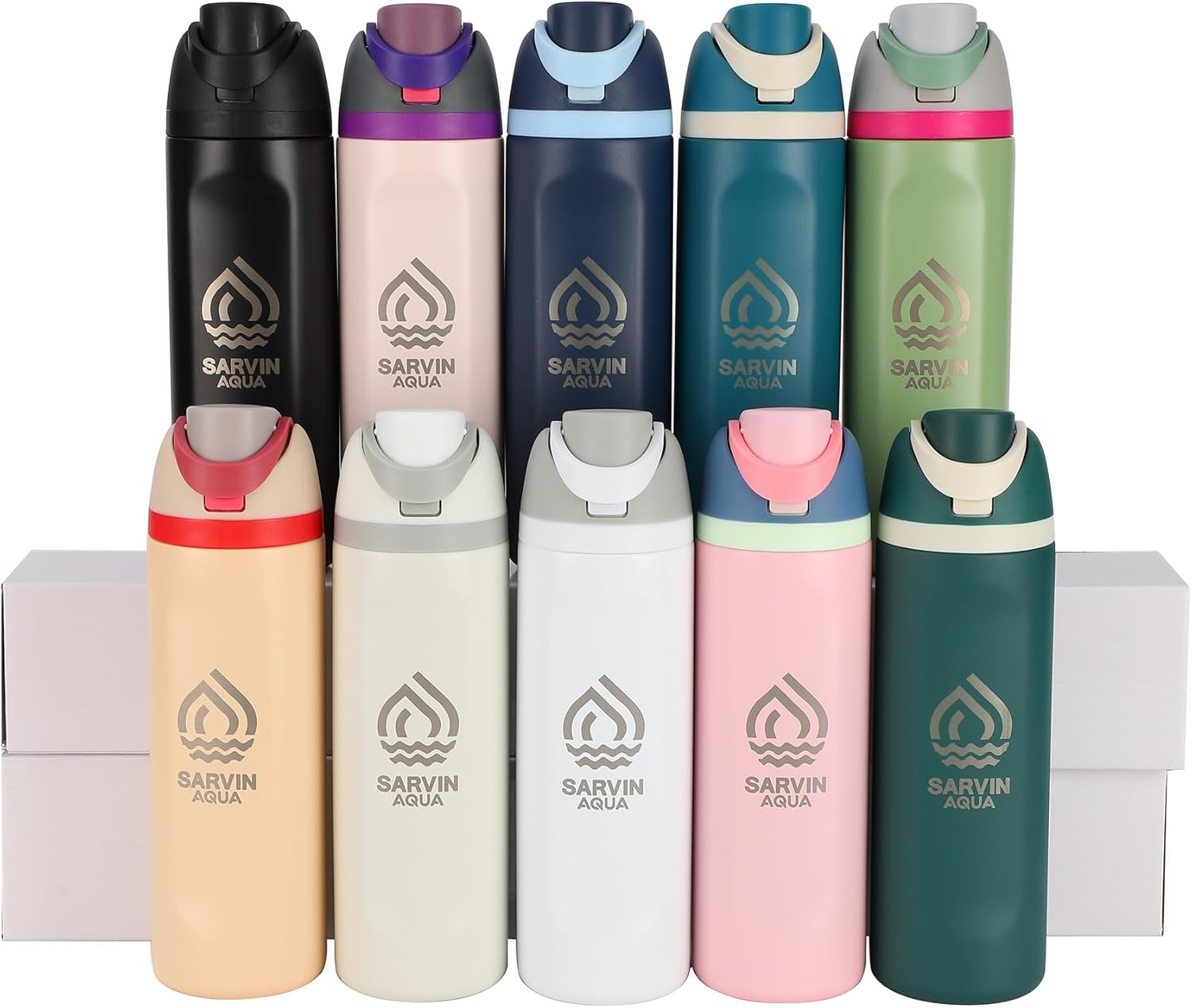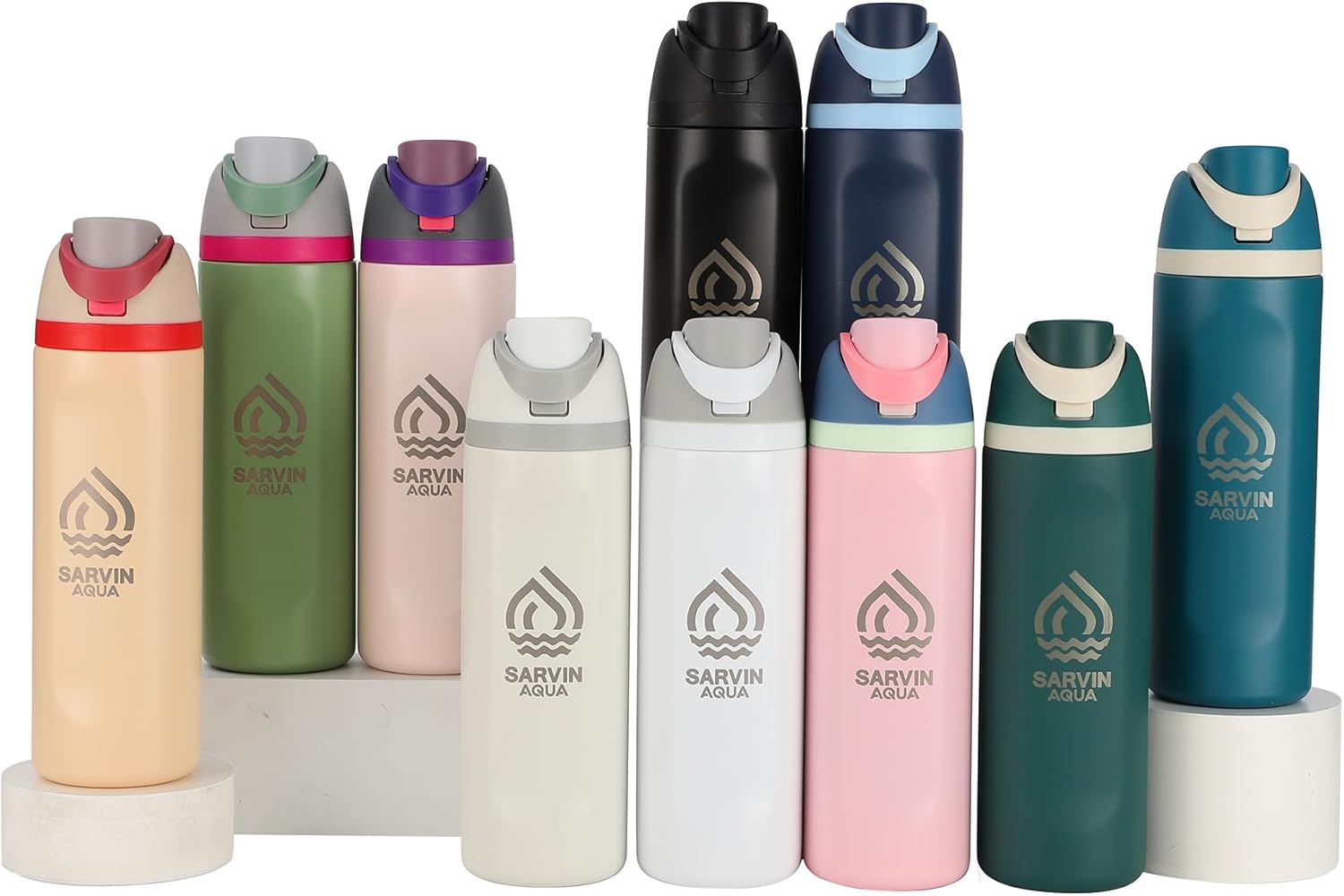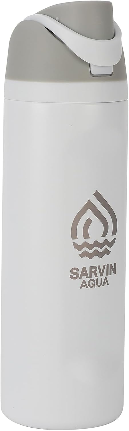 Stay hydrated in style with the Sarvin Aqua 24 oz Insulated Stainless Steel Water Bottle, available in fourteen stunning colors to suit every personality and lifestyle. Built with advanced double-wall vacuum insulation, this reusable bottle keeps beverages cold for up to 24 hours and hot for up to 12 hours — perfect for workouts, office days, or outdoor adventures. The leak-proof push-button lid with safety lock allows easy one-hand use, while the protective spout cover keeps your drinking area clean and hygienic. A carry-loop handle adds grab-and-go convenience, and the slim design fits in most car cup holders and gym bags. Crafted from premium food-grade stainless steel, every Sarvin Aqua bottle is BPA-free, lead-free, and phthalate-free, ensuring safe and eco-friendly hydration. The durable powder-coated finish resists scratches and maintains a sleek, stylish look for years. Choose from fourteen elegant colors — Midnight Black, Navy Blue, Ocean Blue, Deep Green, Peach Purple, Pure White, Mist Grey, Fresh Green, Sand Beige, White-Grey, Sky Blue, Rose Pink, Lemon Yellow, and Olive Green — and enjoy fresh-tasting water wherever life takes you.