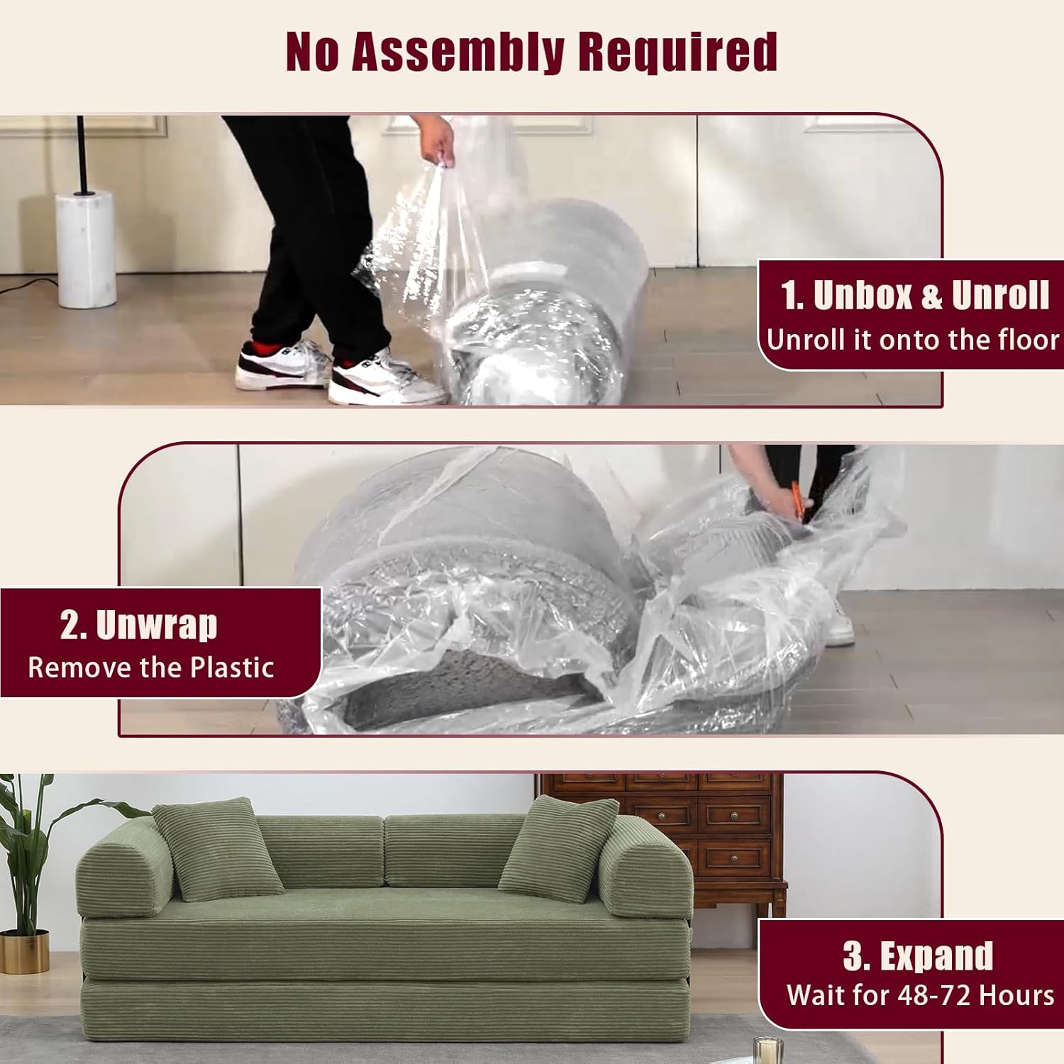 ✔ [No Assemble Required & One-box Shipping]: Boneless design and compression techology make our sofa bed no need for assembly, just take it out and waiting for 48-72 hours for full expansion and use. It is one box shipping, you do not have any trouble to receive multiple packages.