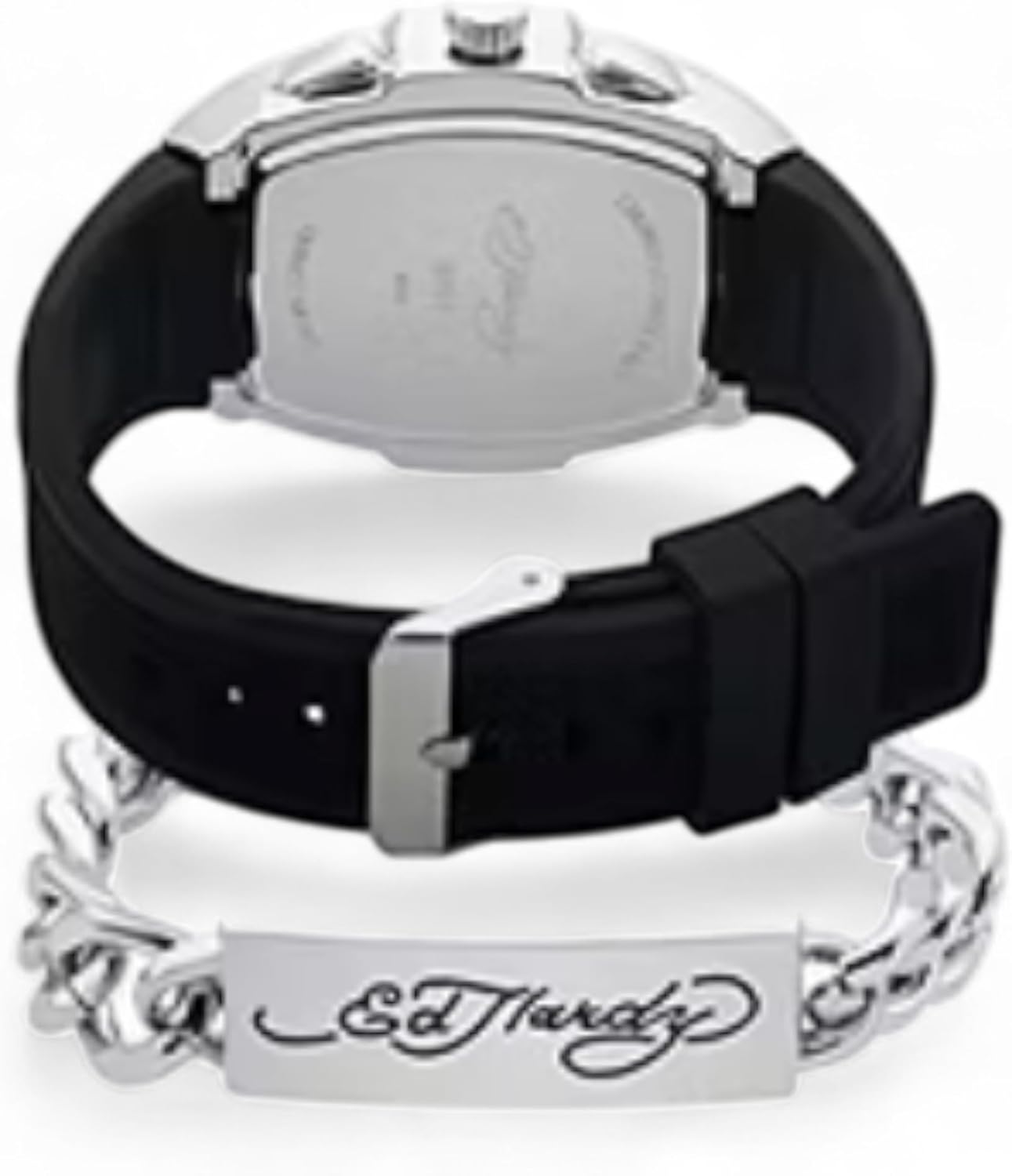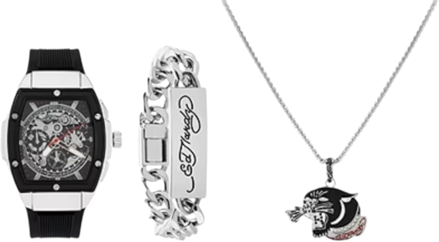 ED HARDY Men's 3 Piece Silver Tone Watch Set with Necklace and Bracelet