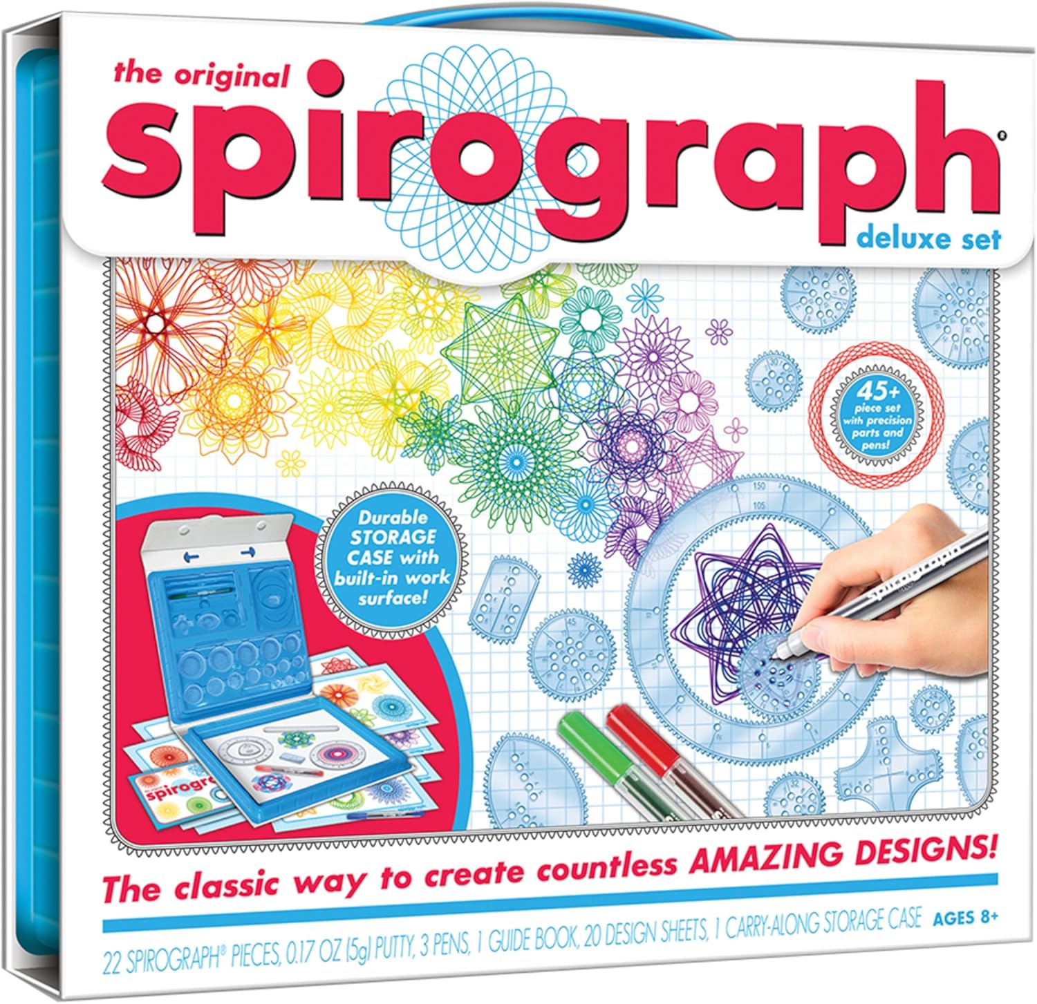 ¡El kit de arte en espiral original para niños está de vuelta y mejor que nunca! Los artistas aspirantes pueden crear diseños sin fin con el Original Spirograph Deluxe Set. Cuenta con las ruedas y anillos icónicos del set de arte giratorio original, actualizado para hoy. El set de dibujo para niños de 8 años en adelante cuenta con un estuche resistente con almacenamiento a presión y superficie de dibujo incorporada. Incluye numerosos suministros de artes y manualidades, incluyendo plastilina Spirograph para sostener las piezas de forma segura en el papel. No es solo un kit de arte para niños de 8 a 12 años; también es un Spirograph para adultos que recuerdan los juguetes y juegos vintage y retro. El set de colorear para niños también viene con papel para diseño y una guía de diseño a todo color para ayudar con el dibujo de tus hijos. Si buscas juegos para niños de 8 a 12 años, o regalos para niños que aman los kits de arte y los sets de colorear, este set de dibujo Spirograph para niños es la elección perfecta.