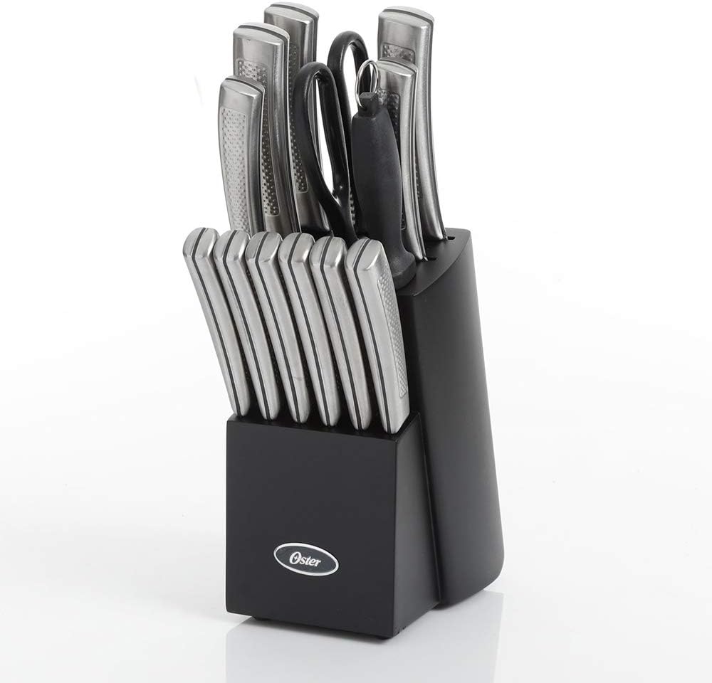 Juego de cubertería de acero inoxidable Oster Wellisford de 14 piezas con bloque negro incluye: cuchillo de carnicero de 8 pulgadas, cuchillo para pan de 8 pulgadas, cuchillo santoku de 6.5 pulgadas, cuchillo utilitario de 5 pulgadas, cuchillo pelador de 3.5 pulgadas, afilador, tijeras, 6 cuchillos para bistec de 4.5 pulgadas, bloque de MDF negro