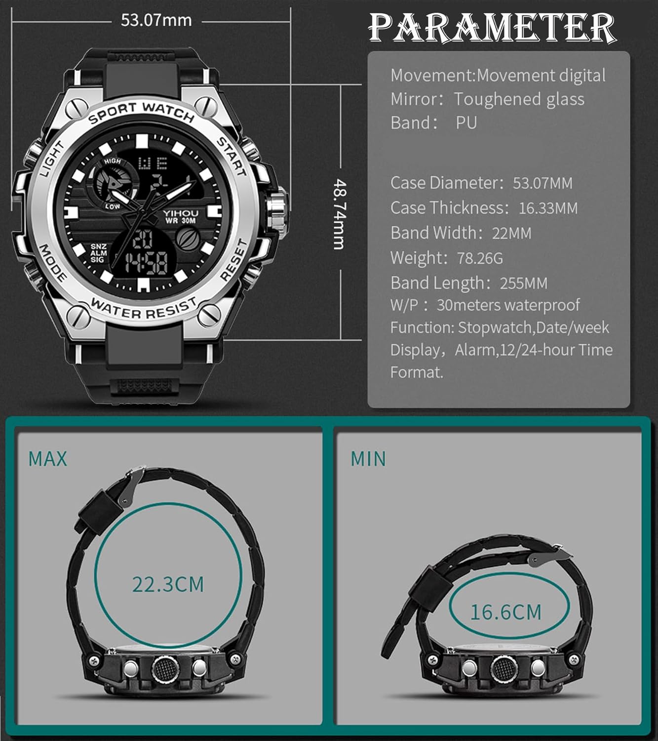 Reloj militar de moda Yihou - resistente al agua, retroiluminación, alarma, cronómetro, tiempo militar 12/24 horas, calendario, resistente a golpes. Especificación: - Máximo de muñeca: 8.8” - Mínimo de muñeca: 6.5” - Ancho de la banda: 22mm - Diámetro de la caja: 2”/ 53mm - Grosor de la caja: 0.6”/ 16mm - Peso: 2.7oz/ 76g - Movimiento: Cuarzo - Tipo de cierre de la banda: Hebilla - Profundidad de resistencia al agua: 30M/ 98FT Material: - Banda: PU - Cuerpo: ABS NOTA: - Evite el uso en temperaturas extremas de calor o frío. - Si se encuentran neblinas o gotas en la superficie del reloj, comuníquese inmediatamente con el fabricante para mantenimiento y prevenir la corrosión de los componentes internos por humedad. - Se recomienda limpiar la correa con un paño suave regularmente. - POR FAVOR NO PRESIONE NINGÚN BOTON EN EL AGUA.