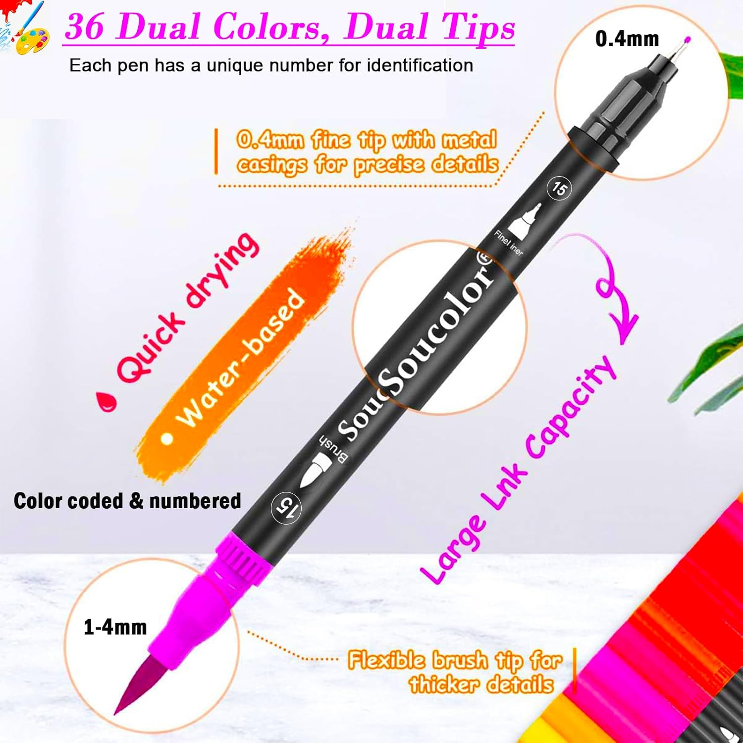 Soucolor Art Brush Markers Lápices para Libros de Colorear para Adultos, 36 Colores Puntas Duales (Cepillo y Punta Fina) Marcadores para Niños Toma de Notas, Planificación, Caligrafía, Dibujo, Diario