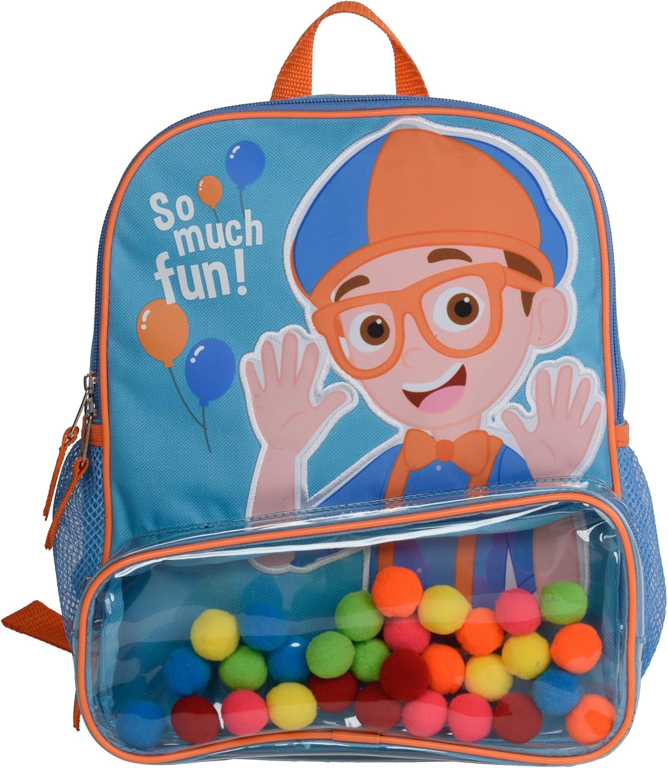 Diseño: La parte delantera de la mochila presenta una parche bordado del personaje de Blippi con un chip de sonido que saluda de Blippi cuando presionas su pajarita y un bolsillo de PVC transparente con pompones flotantes.
