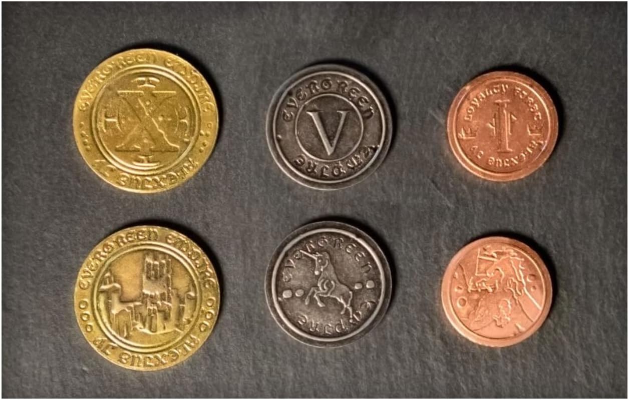 Estos son increíblemente detallados y, por supuesto, son muy pesados. El conjunto completo pesa 10.5 onzas (poco menos de 300 gramos), es más de 1/2 libra. Contenido: 25 monedas de cobre "I" (la moneda de 1) 15 monedas de plata "V" (la moneda de 5) 10 monedas de oro "X" (la moneda de 10)