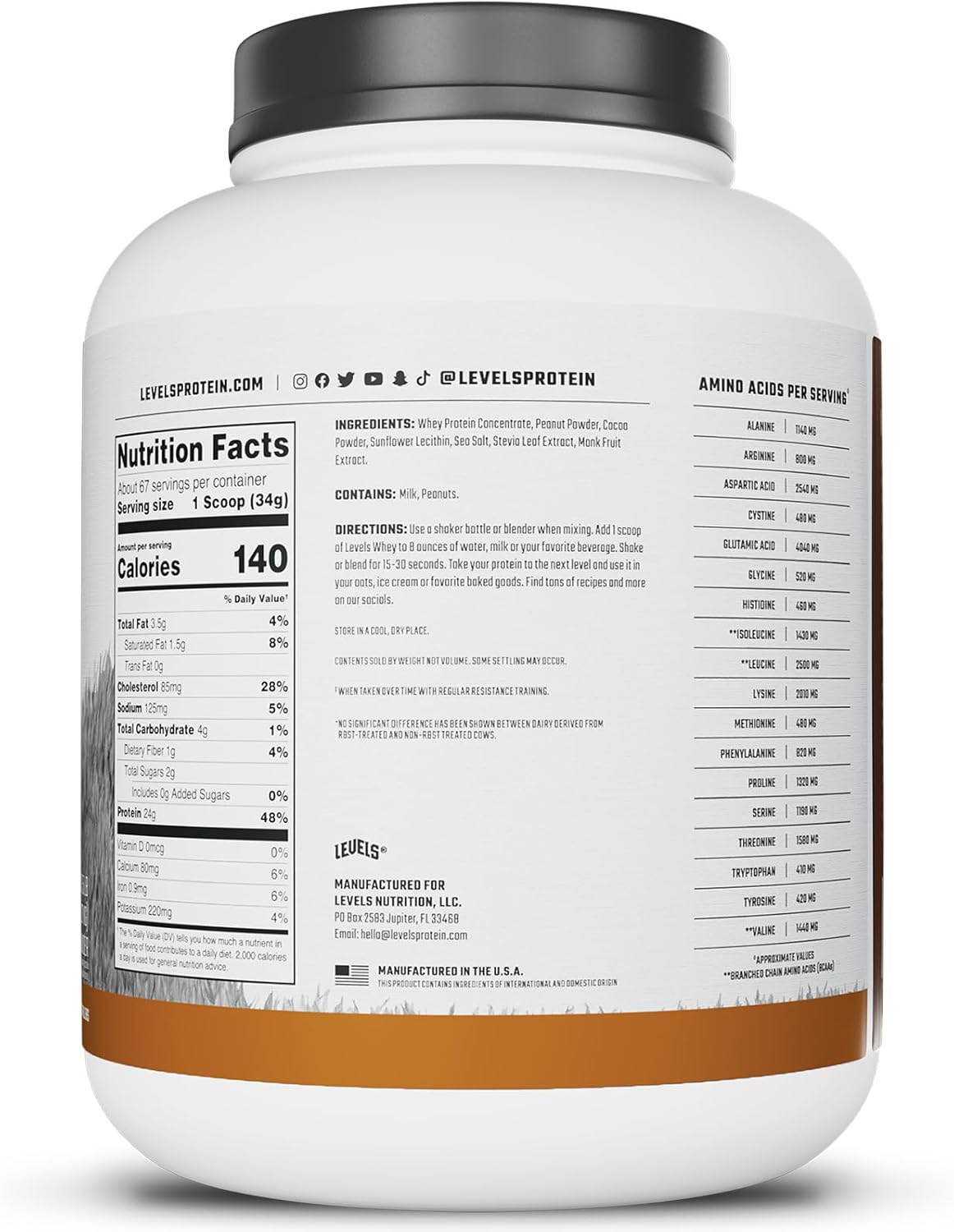 Levels Proteína en Polvo de Suero de Leche Natural, Sin Artificiales, 24g de Proteína, Chocolate y Maní, 5LB