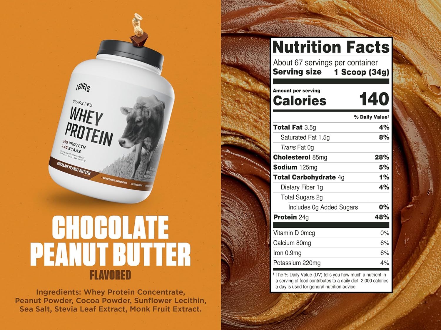 SIMPLE Y LIMPO: Aquí no hay sabor falso a maní. El suero de leche de Chocolate y Maní Levels está hecho con deliciosos cacao y maní en polvo, ligeramente endulzado con extracto de fruta de monja.