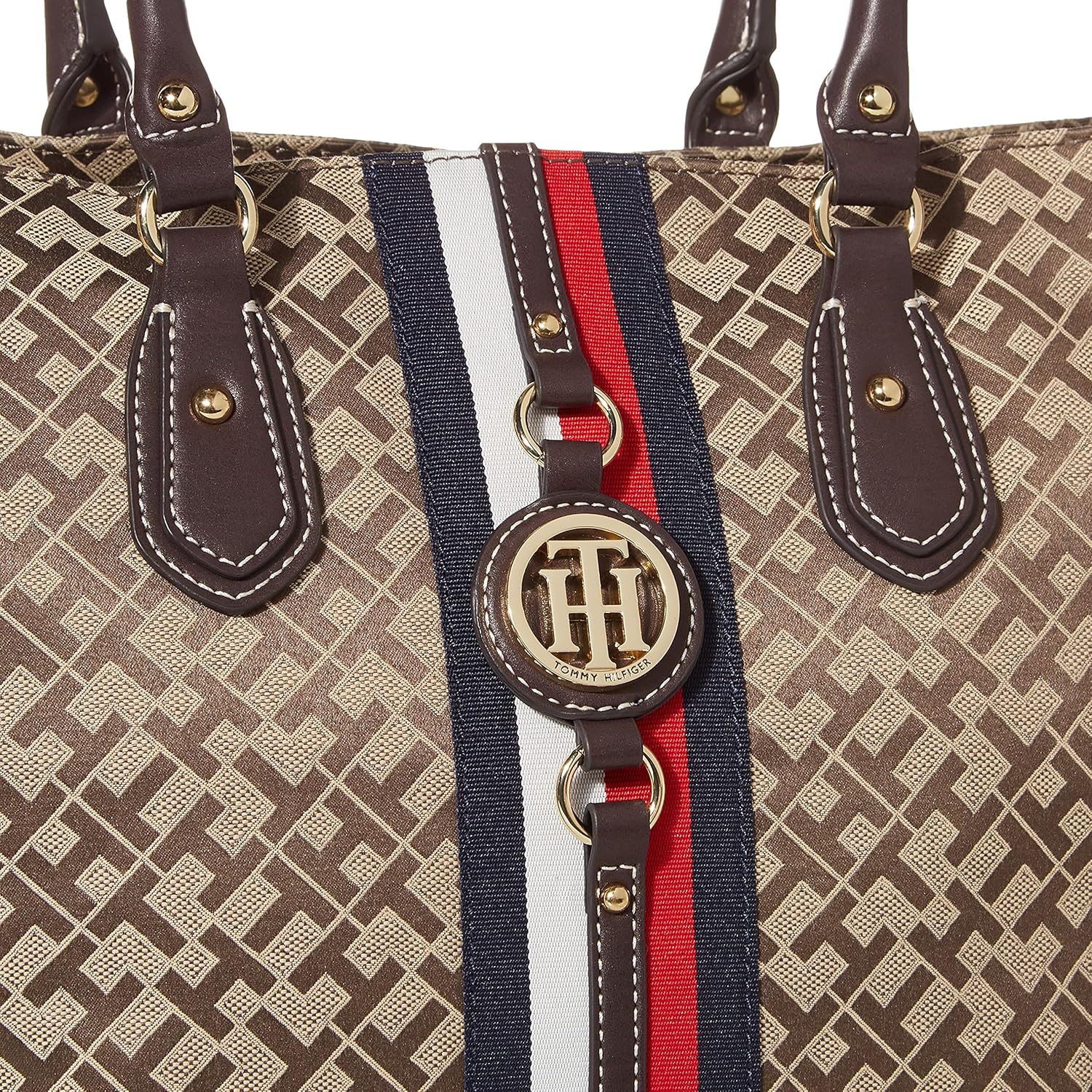 Bolsa tote para mujer con la característica franja de la bandera y hardware dorado TH de Tommy Hilfiger. Asas dobles con detalles de hardware dorado. Fondo plano, cierre superior con cremallera. Interior de nylon forrado con bolsillo con cremallera lateral y bolsillo de deslizamiento. Esta bolsa Tommy Hilfiger es un accesorio esencial versátil, perfecto para tu próxima bolsa de trabajo. Nuestra bolsa tote para mujer es una elegante adición a tu colección de bolsas de viaje para escapadas de fin de semana. 17" de longitud; 11-1/2" de altura; 6-3/4" de ancho; 9" de caída.