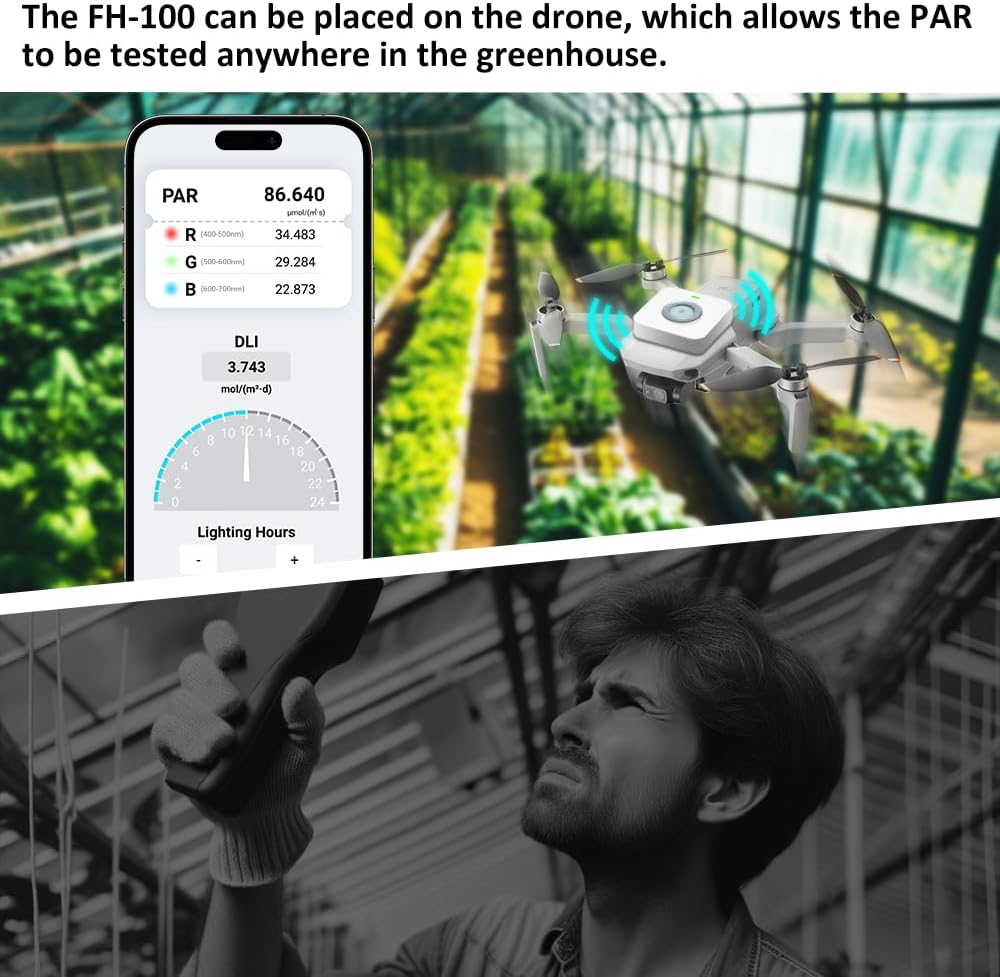El FH-100 puede colocarse en el dron, lo que permite probar el PAR en cualquier lugar del invernadero.
