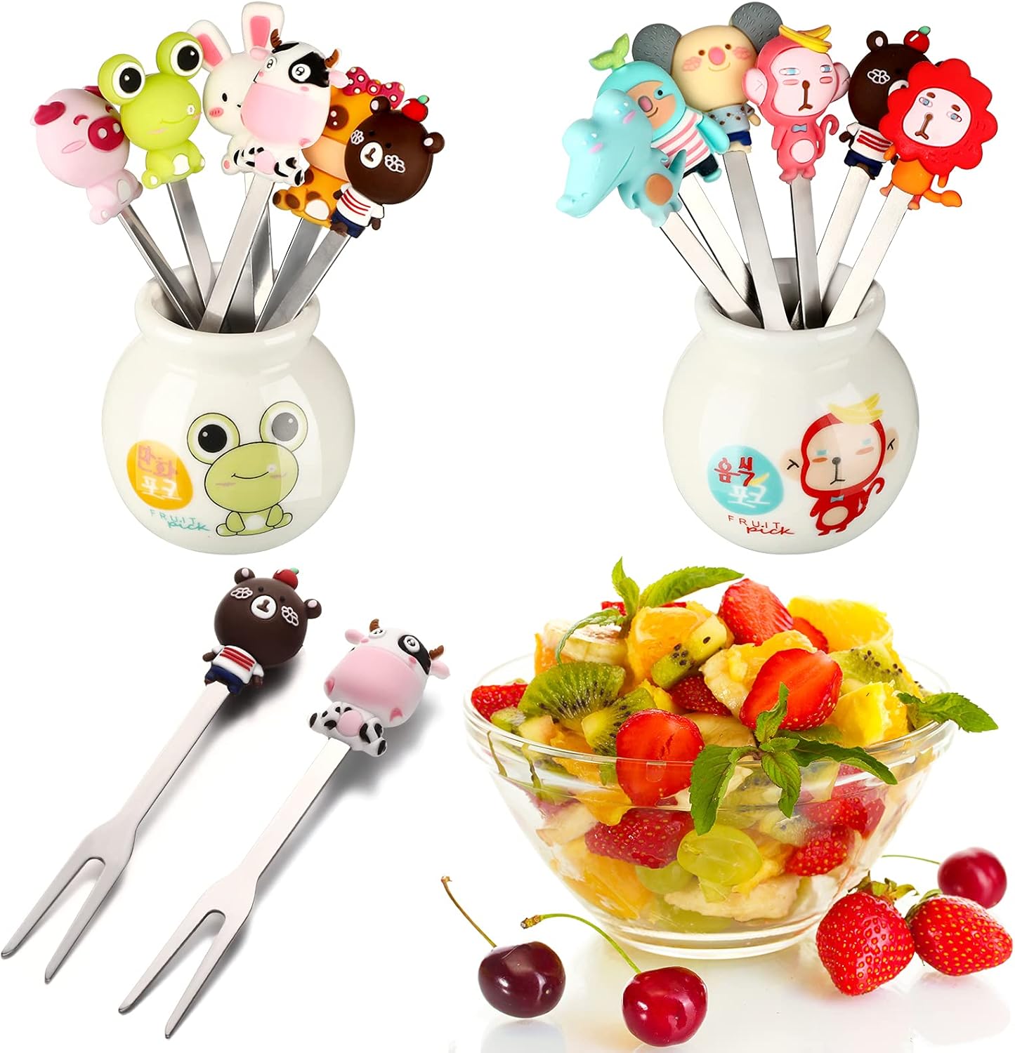 12 Piezas de Pinchos para Frutas para Niños con 2 Tarros de Cerámica Set de 2 Cucharillas de Frutas de Dibujos Animados Lindos Pinchos de Acero Inoxidable para Niños con Mangos de Silicona Suministros para Fiestas de Regreso a Escuela