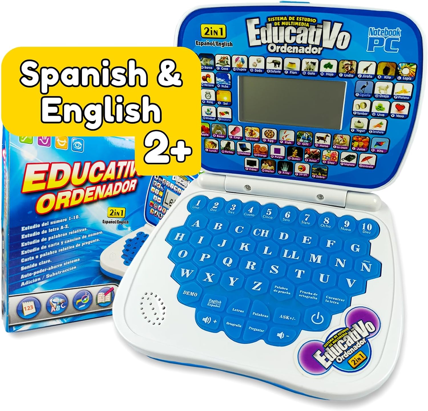 Audio en español e inglés. Esta laptop educativa tiene 6 modos de juego y aprendizaje que desarrollan el aprendizaje preescolar de los niños en 2 idiomas: español e inglés. Esto incluye palabras, alfabeto, números, suma y resta matemáticas. Haz ortografía, cuestionarios y lectura que desarrollarán sus habilidades de habla bilingüe.