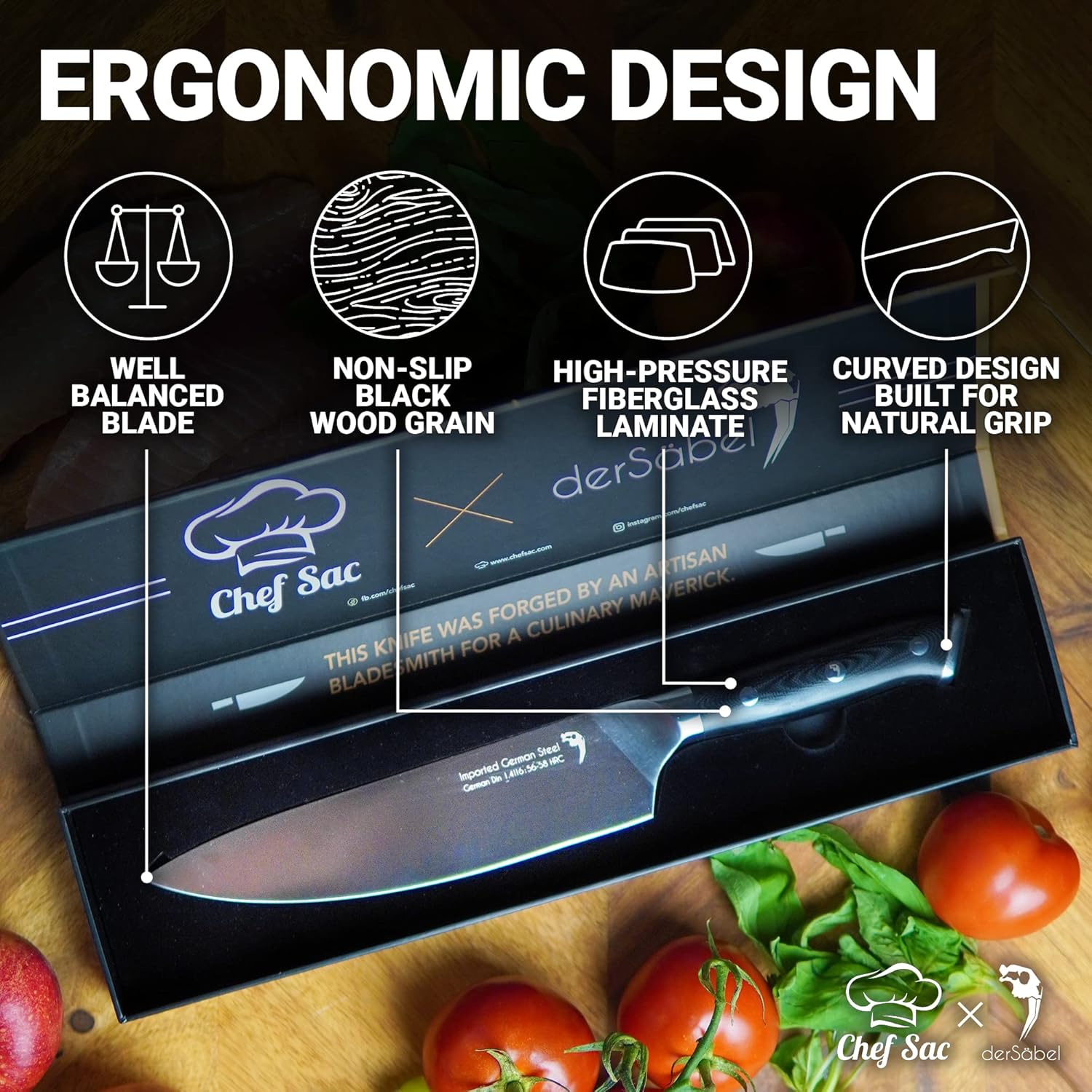 🔪 CUCHILLO DE COCINA PROFESIONAL DE ALTA CALIDAD - ¡Realiza tu próxima tarea de cocina con facilidad gracias al Cuchillo Chef de 8 Pulgadas Chef Sac x Der Sabel! Esta hoja robusta y ultra afilada está hecha de acero inoxidable premium endurecido que no se oxida ni se desafila. Cuenta con un mango de fácil agarre y retención duradera del filo para que no tengas que preocuparte de que esta hoja se vuelva romo incluso después de un uso prolongado. ¡Tus ingredientes quedarán perfectamente picados cada vez que saques este mejor ayudante del cocinero en la cocina!