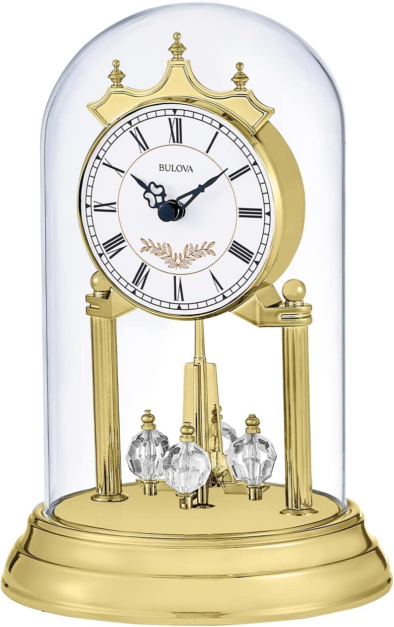 Reloj Aniversario Heather Bulova B8821 | Diseño de cúpula de cristal de 9" | Péndulo de cristal giratorio | Campana de Westminster | Placa de grabado