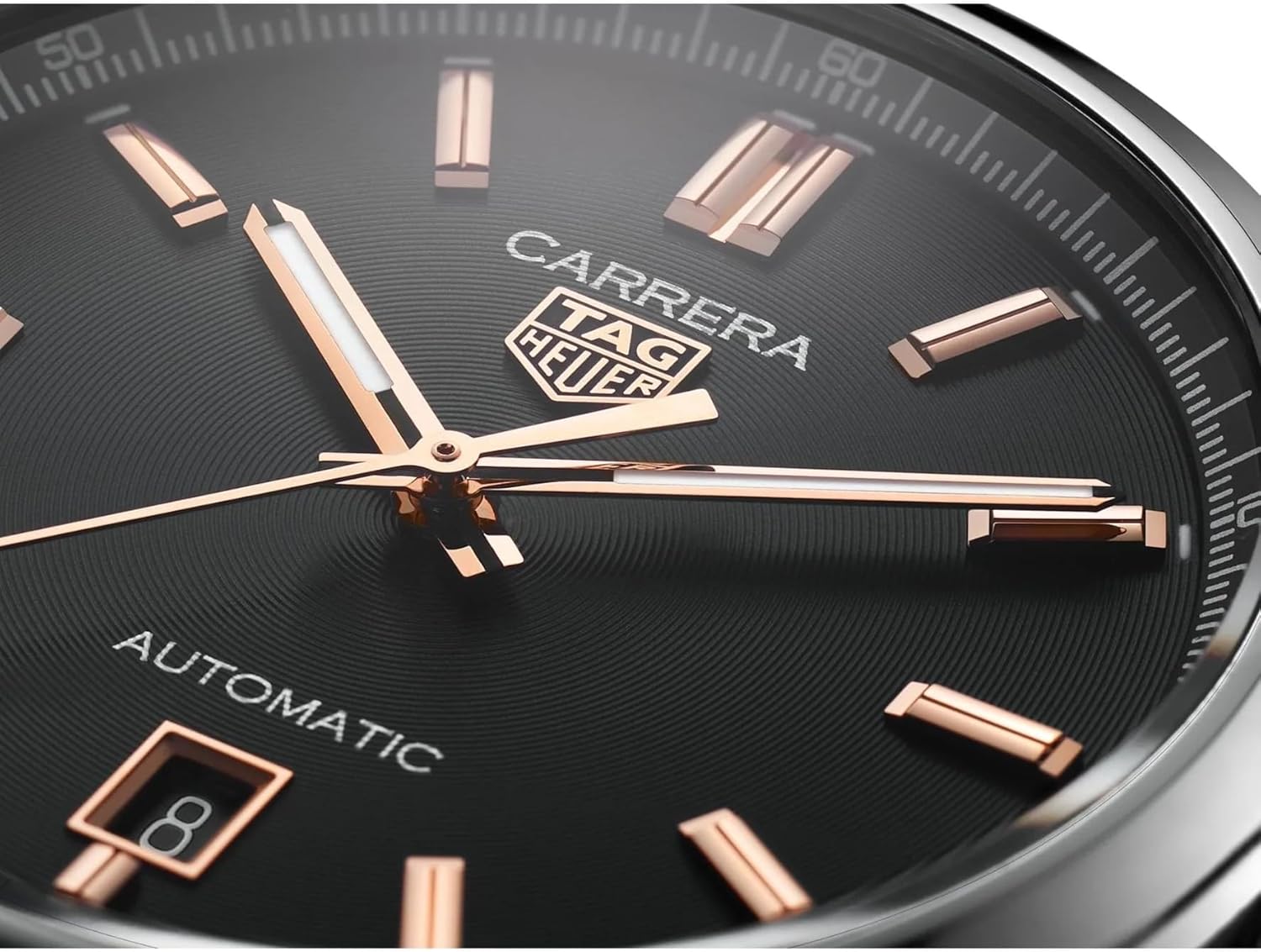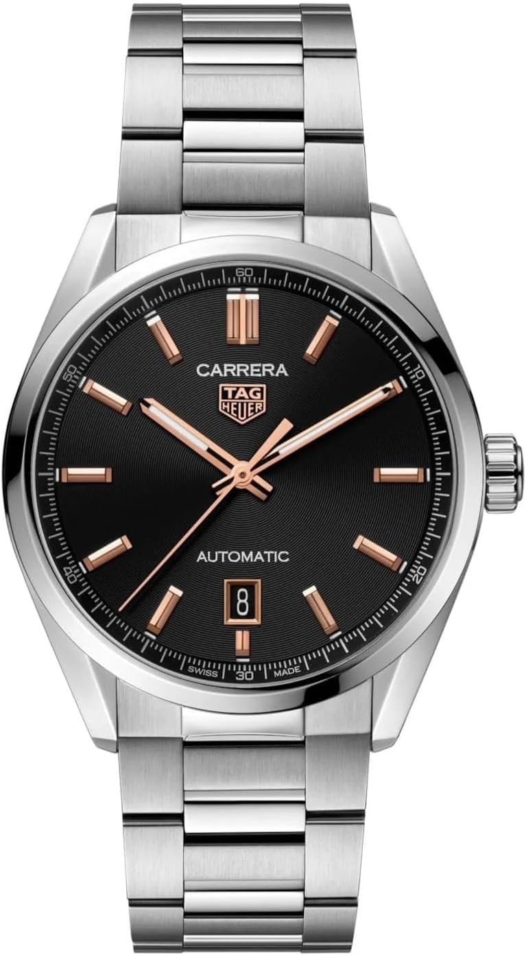 Con su dial negro indulgente y detalles en oro rosa de 5N, este TAG Heuer Carrera está hecho para los habitantes de la ciudad. Detrás del lujo llamativo se esconde una convicción: con su calibre automático y construcción técnica, este reloj es tan fuerte como ambicioso. Leer más Entrega y devolución gratuitas Tu pedido se entregará gratuitamente. Se proponen múltiples métodos de entrega seguros en función de tu ubicación durante el paso de pago. Si por alguna razón no estás satisfecho con tu compra, nos complacerá organizar tu devolución. Todos los pasos de devolución y una etiqueta prepagada se incluirán en tu paquete para una devolución fácil. Servicios exclusivos en línea Solo disponibles en línea, tu reloj mecánico se entregará en una caja exclusiva. Un elegante estuche de viaje estará en tu paquete para acompañarte en tus viajes (esta oferta no incluye relojes Connected). Los relojes Connected se entregan en una caja exclusiva dedicada. Pagos seguros Todas las transacciones realizadas en este sitio web son seguras y protegidas. Activación automática de garantía Al comprar tu reloj en la página web oficial de TAG Heuer, estás garantizado a recibir tu pieza con una garantía internacional de 2 años. La activación de tu garantía internacional de ventas se maneja completamente por TAG Heuer y no se requiere ninguna acción por tu parte para validarla. Programa de intercambio de relojes Connected Si tienes un reloj Connected TAG Heuer de una generación anterior y deseas tener uno nuevo, puedes beneficiarte de nuestro Programa de Intercambio de Relojes Connected. Por favor, contacta con nuestro Servicio al Cliente o visita la página del Programa de Intercambio de Relojes Connected para obtener más detalles. Los TAG Heuer Connected Golf Edition no son elegibles para el Programa de Intercambio. Paga a plazos Una forma nueva, conveniente y sencilla de pagar tu pedido en línea. Compra hoy y paga a plazos con el plan que elijas de Klarna. Con 0% de intereses y sin comisiones, tus pagos automáticos se realizan mensualmente. Los detalles finos aportan elegancia a este seguro reloj de 39 mm. Las manecillas, índices y el logotipo de TAG Heuer chapados en oro rosa de 5N hacen una declaración distintiva. Una caja de acero refinada con líneas elegantes y estilizadas. Cada curva y superficie pulida proviene de la experiencia de la Maison. Un diseño distintivo. El dial está protegido por un cristal de zafiro con tratamiento antirreflejos, y la caja es resistente al agua hasta 100 metros. Un clásico imparable. Tamaño 39 mm Grosor 11,50 mm Distancia de las bisagras 20,50 mm Resistencia al agua 100 m Caja Acero Cepillado/Pulido Bisel Bisel fijo de acero Tapa de la caja Acero Material Acero Acabado Cepillado/Pulido Hebilla Cierre de doble seguridad con botones de presión - Acero Color Negro Calibre Calibre 5 Movimiento automático Reserva de marcha (horas) 38 H Frecuencia del balance 28.800 (4 Hz) Funciones Horas, minutos, segundos, fecha WBN2113.BA0639