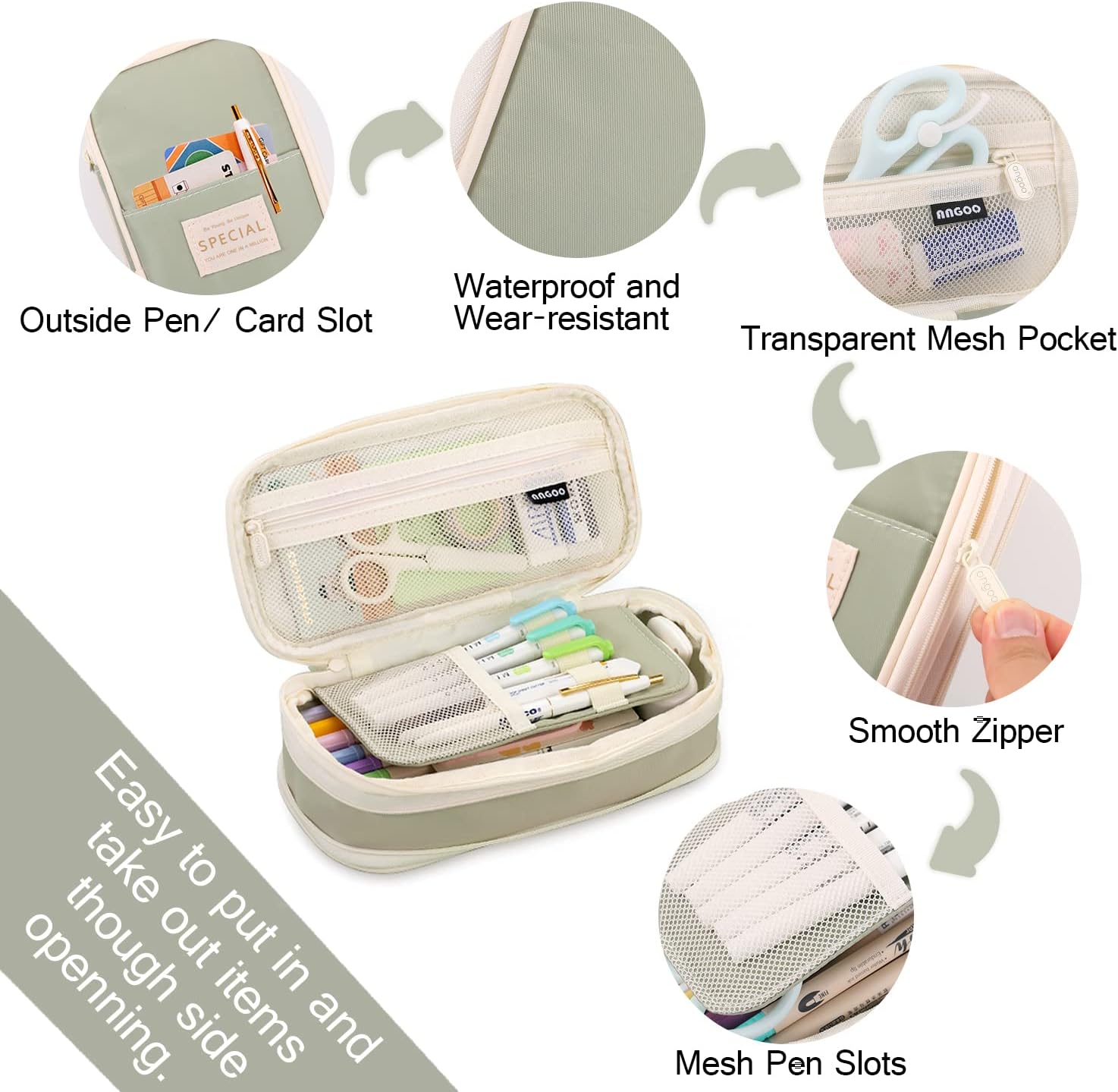 【Característica detallada】Diseño actualizado con un bolsillo frontal para guardar pequeños artículos como tarjetas, reglas, etc. Un pequeño bolsillo de malla para organizar la papelería pequeña que usa con frecuencia, 5 ranuras para bolígrafos para guardar los bolígrafos importantes, un compartimento grande para organizar más bolígrafos y accesorios de papelería