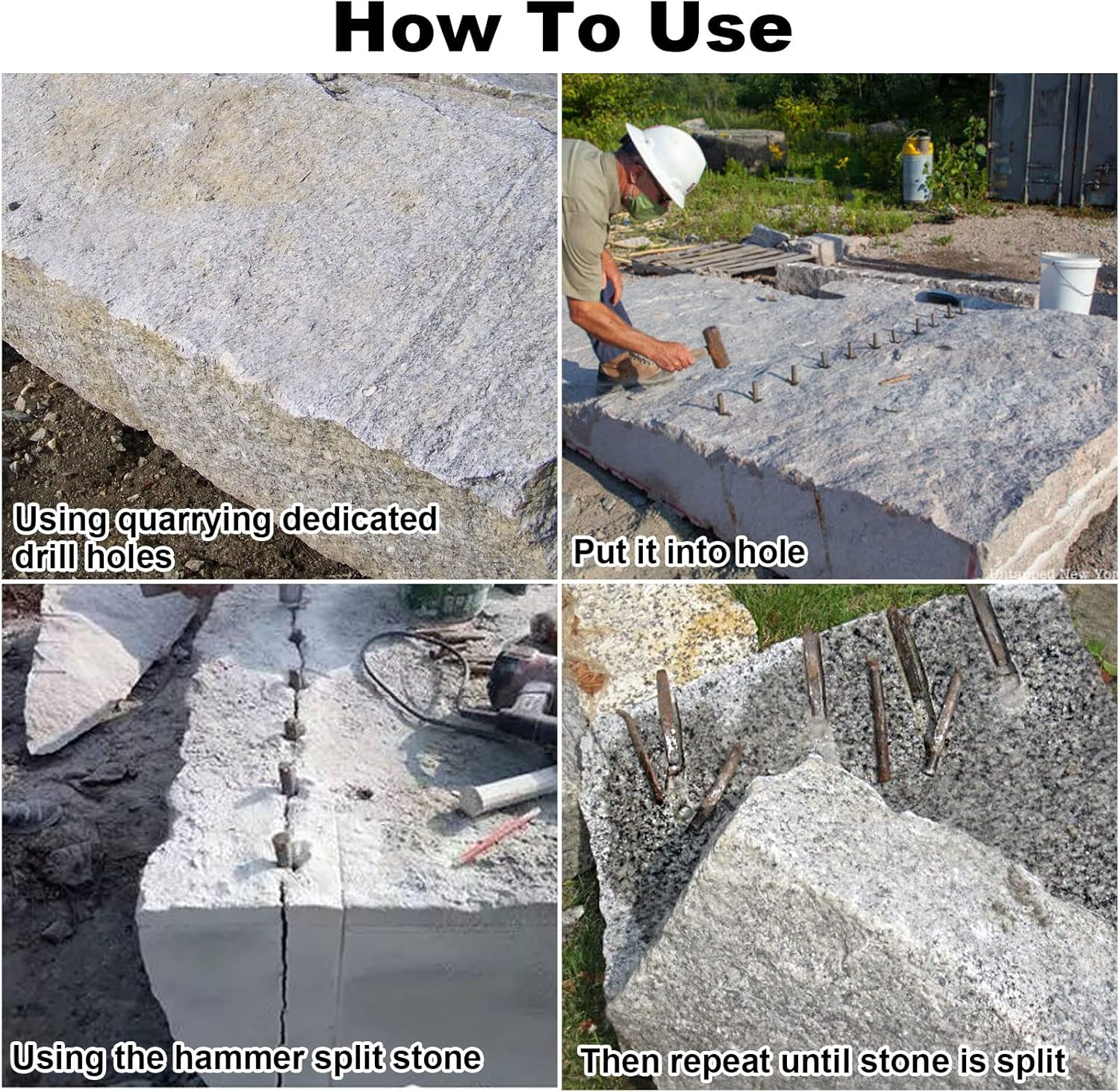 Paquetes de 8 de Talones y Láminas de Despiece, Herramientas Manuales de Divisadero de Hormigón, Roca, Granito, Mármol ABuff de 3/4 Pulgada -El concepto de estos dispositivos es que dividen las rocas aplicando presión desde el interior hacia afuera. Se utilizan para dividir piedra dura, roca, granito, mármol, hormigón. -Los talones y láminas son una forma muy efectiva de dividir piedra, ya sea que necesite un corte preciso o simplemente esté reduciendo el tamaño de un bloque para hacerlo más manejable. Especificación -Material: Carburo Duro -Divisadero de Piedra: 3/4" (19mm); Longitud: 4.15 pulgadas (105 mm); -Se ajusta a un agujero de 3/4" de diámetro. -Cantidad de paquete: 8 juegos de talones y láminas -Cada juego incluye 1x anillo de goma + 1x talo + 2x láminas Cómo usar: 1. Composición de talo central + 2 talones. 2. Usando agujeros de perforación dedicados para canteras, retire el polvo residual del agujero 3. Invertir el lado grande de los 2 talones (plano a plano), y ponerlo en el agujero. 4. Invertir el lado pequeño del talo central entre los 2 talones, y finalmente usar el martillo para dividir la piedra 5. La línea de división puede ser recta o curva. 6. Golpee los talones en secuencia, firmemente, pero sin forzar. Espere unos minutos, luego repita hasta que la piedra se divida. Nota: - Antes de usar, haga las medidas de protección necesarias - Cuando la piedra esté a punto de dividirse, manténgase alerta.