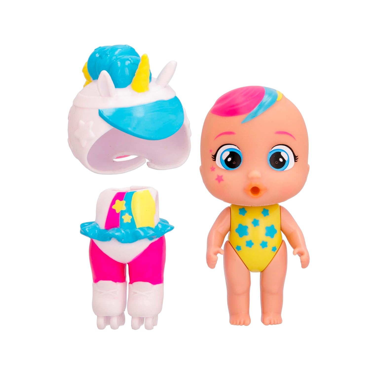 Get ready to travel through space and say hello to the all new Cry Babies Magic Tears Stars Talent Babies. Now with all new transparent packaging, pick the character you want to help complete your collection! Unbox your pack to discover Dreamy, and 6+ surprises and accessories. And of course, like all of your favorite Cry Babies Magic Tears dolls, she cries real tears when you feed her water with her baby bottle. Dreamy is a hip skater dressed in a rainbow colored unicorn suit, and together with all her friends, she puts on an exciting Talent Show! And now, with more articulations, and a removable silicone outfit, mix and match your characters to extend the imaginative play. Create endless stories with your favorite characters in the all new Stars Series and you can watch all the characters perform in their Talent Show in the Cry Babies Original Series on Kitoons! Recommended for ages 3+ years.