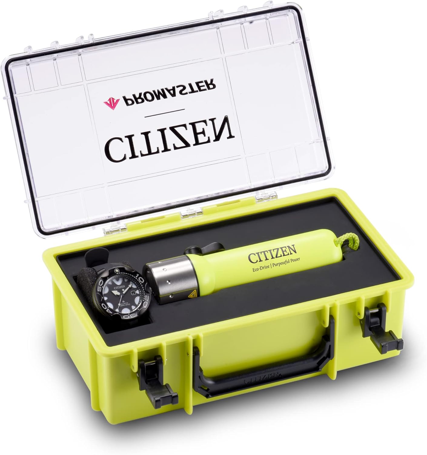 Domina el mar con estilo con el nuevo Promaster Dive en una caja de edición especial que es imprescindible para buceadores y entusiastas serios por igual. Este icónico reloj Citizen para hombre es la última adición a la colección Promaster Sea con un diseño sorprendentemente original inspirado en la majestuosa ballena orca. El reloj deportivo y de alto rendimiento presenta una caja de acero inoxidable negro acentuada por una esfera negra de tres manecillas y fecha con índices horarios elípticos blancos y hendiduras en la bisel que evocan las formas y el esquema de color de la orca, además de toques de color en el marcador de las 12 en punto y la manecilla de minutos. Este reloj de buceo compatible con ISO también cuenta con resistencia antimagnética y antichoque, una bisel giratorio unidireccional para medir el tiempo transcurrido, y manecillas y marcadores luminosos rellenos con un lume superior para la legibilidad. La correa de poliuretano negro imita la forma de la aleta de la orca y se asegura con una hebilla, y el reloj es resistente al agua hasta 200 metros con una corona atornillada, lo que lo convierte en el compañero perfecto para tu próximo buceo, y está alimentado de manera sostenible por la luz con la tecnología Eco-Drive que nunca necesita una batería. El set de edición especial incluye una linterna LED con una luminosidad de 400 lúmenes para una alta visibilidad bajo el agua, resistente al agua hasta 60 metros, y a prueba de arañazos y golpes. Es útil también para el buceo diurno e iluminará áreas oscuras por encima y bajo el nivel del mar, incluyendo la resaltación de los colores de los organismos submarinos. Se suministra con 4 pilas AA Duracell® y correa de muñeca ajustable. Calificación IPX8. Este es el conjunto de lujo definitivo que todo buceador y coleccionista de relojes de buceo querrá poseer.
