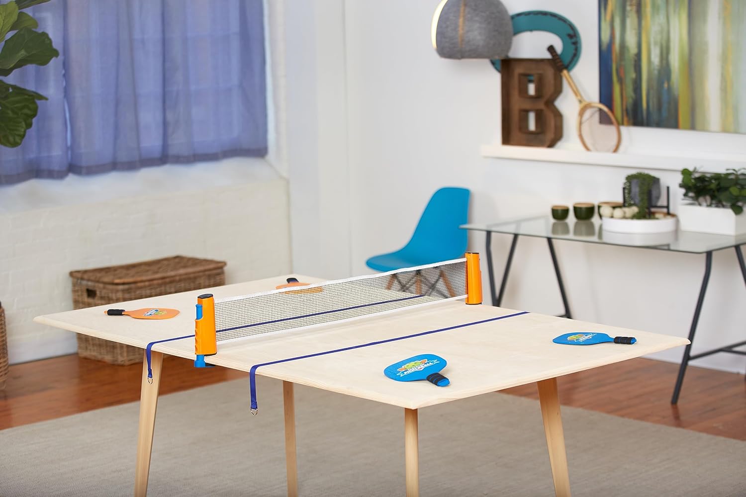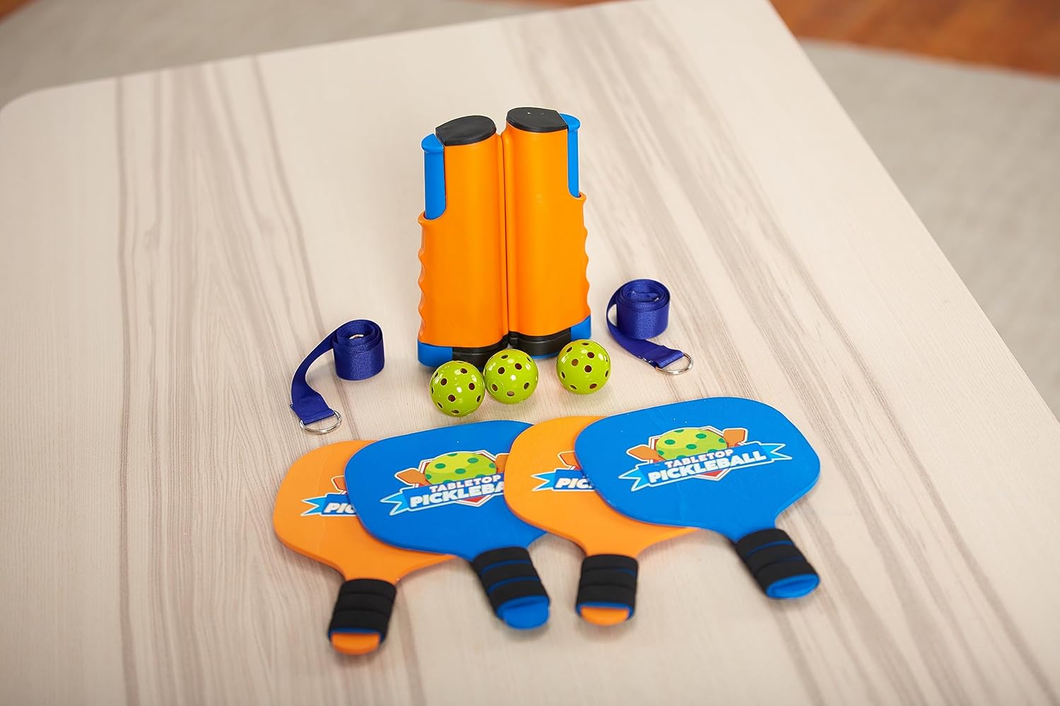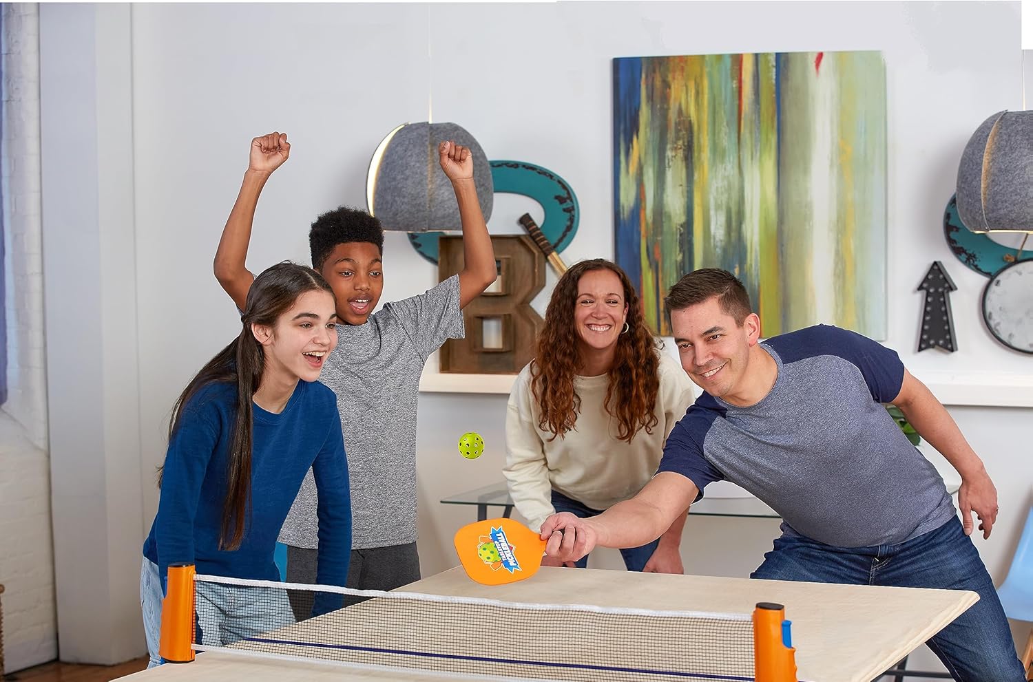 AMADO JUEGO DE PICKLEBALL PARA JUEGO INTERIOR: ¡juega al deporte de rápido crecimiento, Pickleball, en cualquier lugar! *-* RED RETRACTIL QUE SE ADAPTA A LA MAYORÍA DE LAS MESAS: La red retráctil se adapta a la mayoría de las superficies de mesas – ¡hasta 6 pies de ancho! *-* INCLUYE COCINA: ¡No entres en la cocina! Este juego viene con una cocina que es fácil de montar, así como 3 pelotas, 4 raquetas y la red! *-* "GREAT FAMILY GAME: ¡Ideal para niños y adultos de todas las edades! Gran regalo para el fanático del pickleball! Una forma divertida de jugar este clásico juego, en interiores. ​ ​"