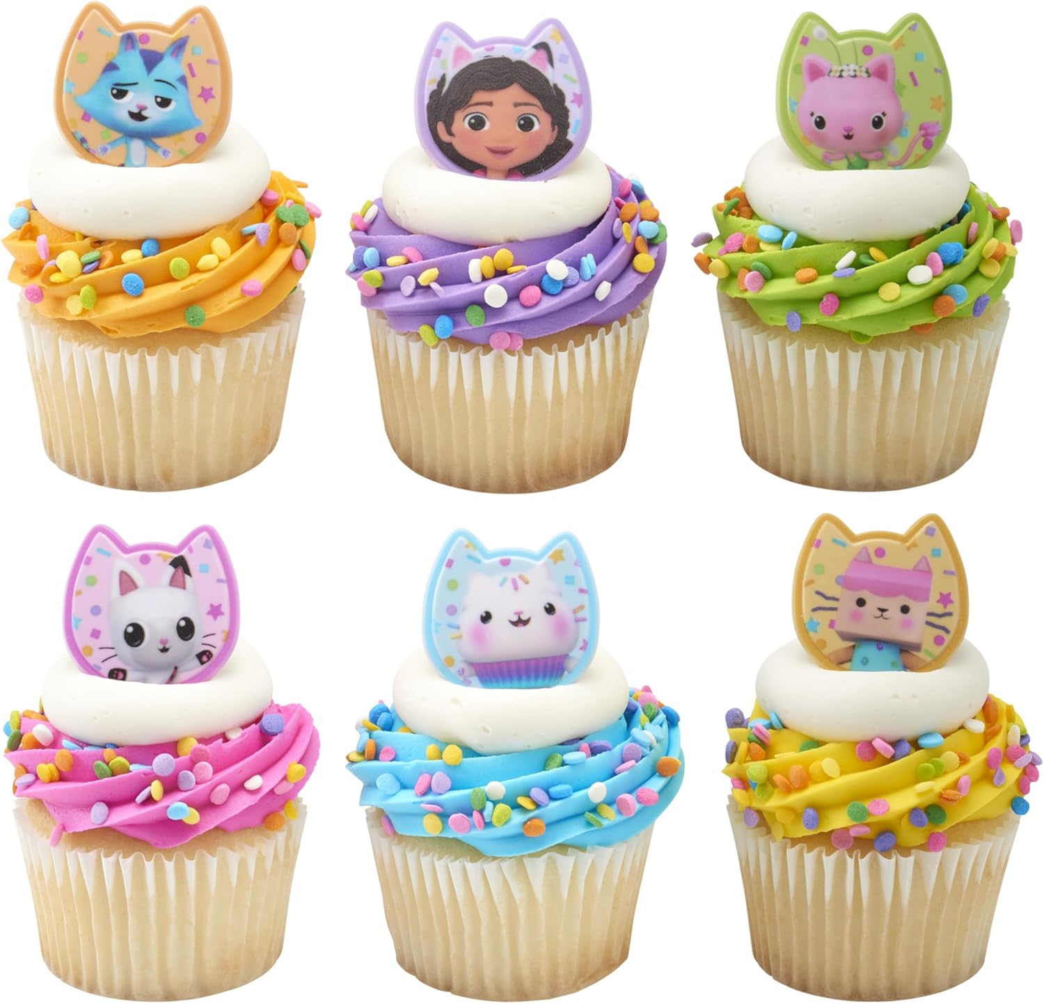 DecoPac DreamWorks Gabby's Dollhouse Cupcake Rings - 24 Colorful Cupcake Rings featuring Gabby, Pandy Paws, Cakey Cat, CatRat, Kitty Fairy, and Baby Box.