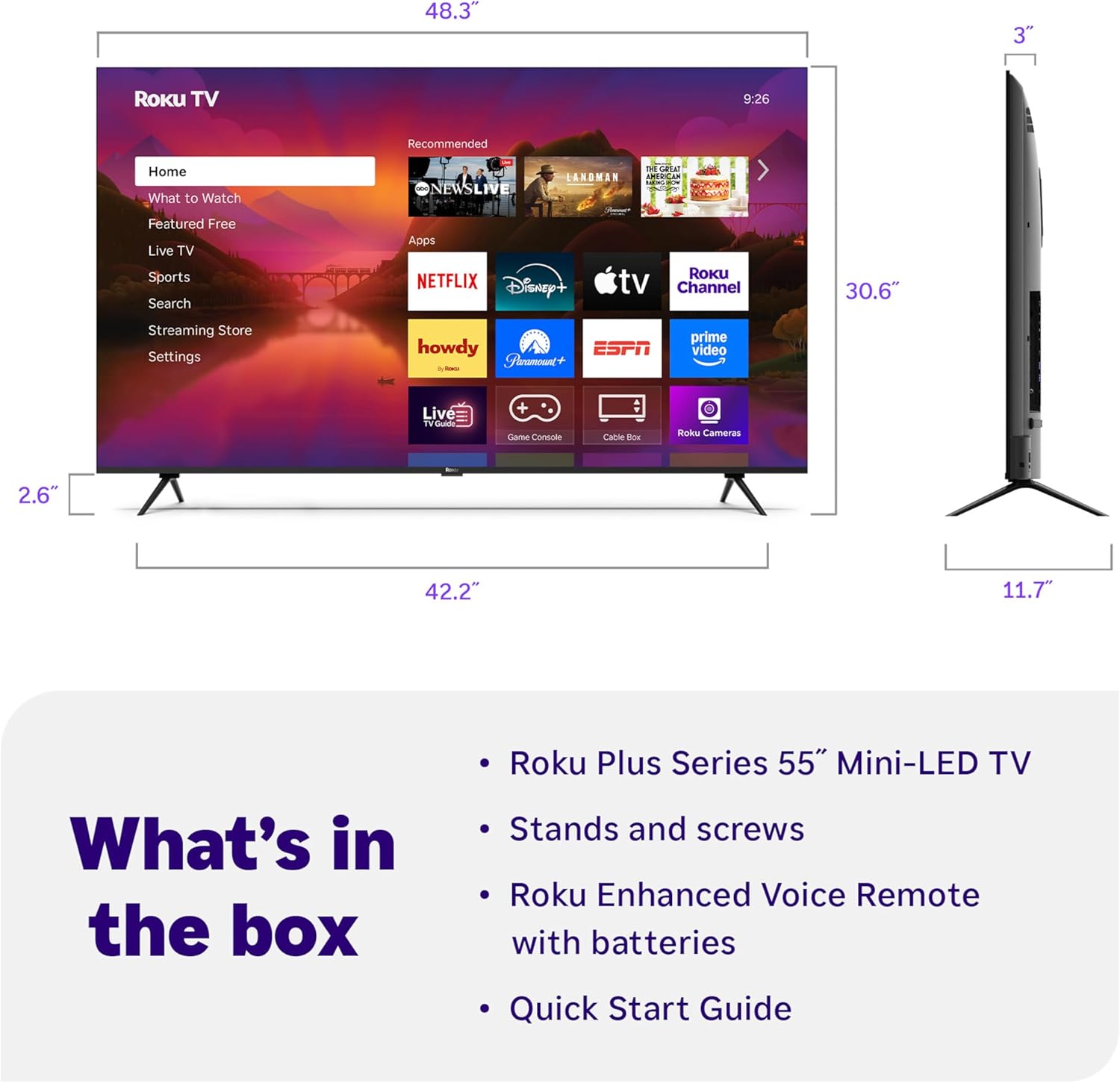 Roku Smart TV 2025 – 55-Inch Plus Series, Mini-LED TV – RokuTV with Enhanced Voice Remote – Flat Screen 4K QLED Television with Dolby Vision & Wi-Fi for Streaming Live Local News, Sports