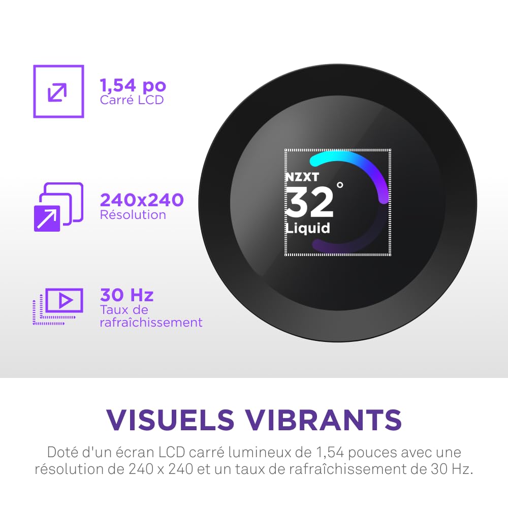 CUSTOM LCD SCREEN — Display real-time system temps, animated GIFs, custom images, or web integrations like Spotify and YouTube on a bright 1.54" square LCD — fully customizable through NZXT CAM software.