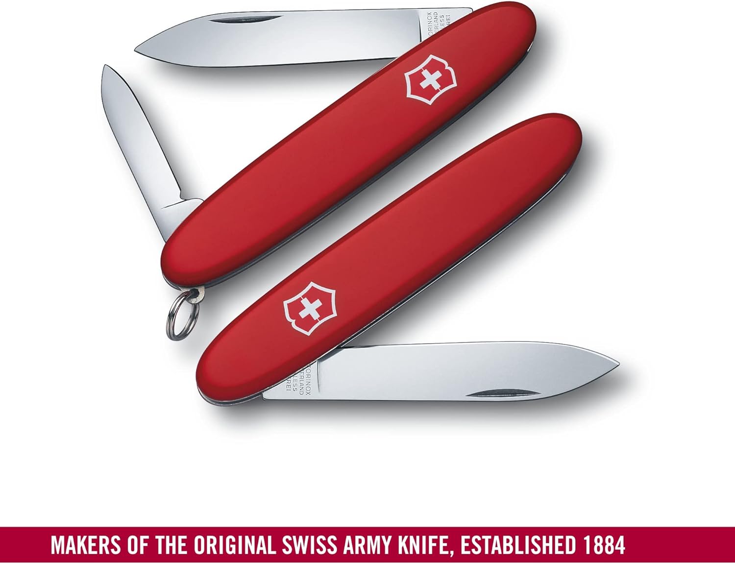 Cuerpo de ejército suizo Victorinox Excelsior con 3 funciones. - - Victorinox Excelsior 0.6901 - Longitud: 84 mm (3,31 pulgadas) - Ancho: 10 mm (0,39 pulgadas) - Peso: 22 g (0,78 oz) - Color: rojo - - Herramientas: - 1. Cuchillo, grande - 2. Cuchillo, pequeño - 3. Llavero - -