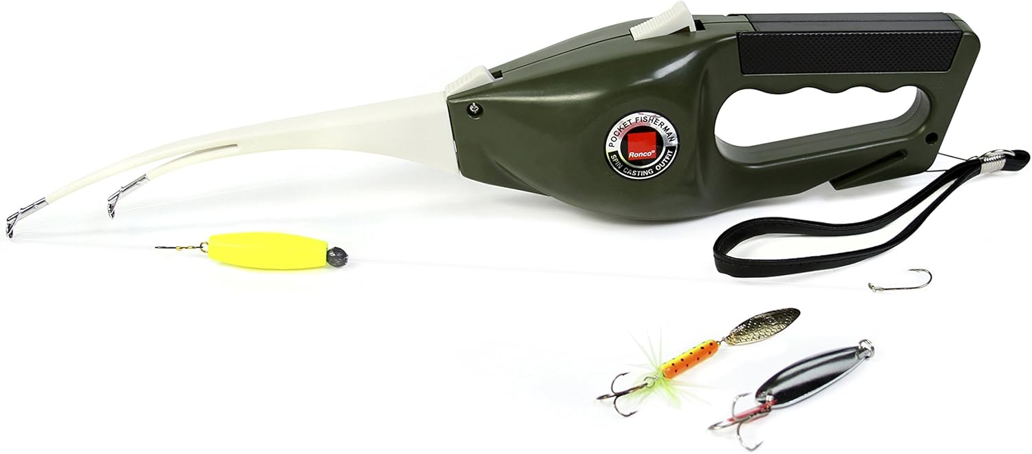 The Ronco Pocket Fisherman Spincasting Outfit has 2 bonus lures. It canfit into your glove compartment. There is an automatic anti-reverse that prevents the handle from turning backwards. It can attach to a belt.