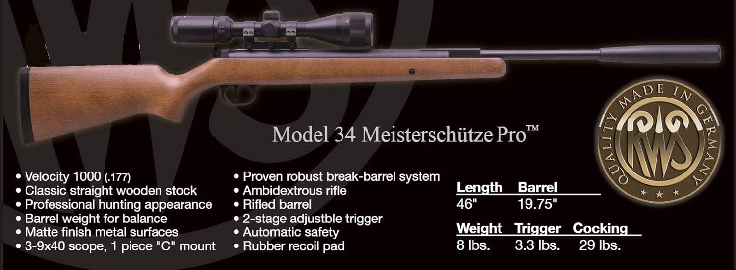 The RWS 34 Meisterschütze Pro Compact Air Rifle (Master Shooter, pronounced "my-stir-shoots") is built from the same reliable RWS air gun as the Model 34 air rifle. It operates from the same proven break barrel system but is professionally finished with a hardwood stock made for both right- and left-hand shooters. The 34 Meisterschutze Pro Compact also has an ambidextrous automatic safety, and rifled barrel. This RWS 34 is time-proven power with a sleek design. The 34 Pro has a matte finish that provides a rich look. Whether you already own an RWS or this will be your first, you won't be disappointed in the fine German air rifle craftsmanship and sleek look.