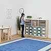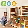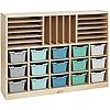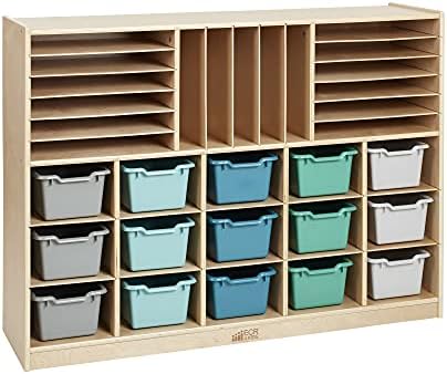 Keep your classroom organized with ECR4Kids Multi-Section Mobile Storage Cabinet with Bins. Kids and adults can organize and store toys, games, building blocks, and school supplies that may otherwise be forgotten. Designed to grow with little ones, this storage cabinet with 15 cubbies, 12 trays, and five slots helps parents, teachers, and educators keep small items within reach. The various sizes of storage slots give children their cubby at school to store homework, art pieces, and other personal items. Durable plastic bins feature rounded edges, an easy-to-grasp scoop front handle, and a curved interior to simply remove contents. Lightweight bins are easy to carry between activities. The low-profile open-face shelves encourage little ones to select their favorite activity independently, introduce organizational skills, and clean up when playtime is over. Four casters are included for mobility; move the storage unit from a hallway to the art room. Constructed from sustainably harvested birch plywood with a durable finish sealing the wood surface and resisting scratching. A UV inhibitor helps furniture resist ultraviolet light and yellowing. Birch plywood is extremely durable and will hold up to everyday use in an early childhood environment.