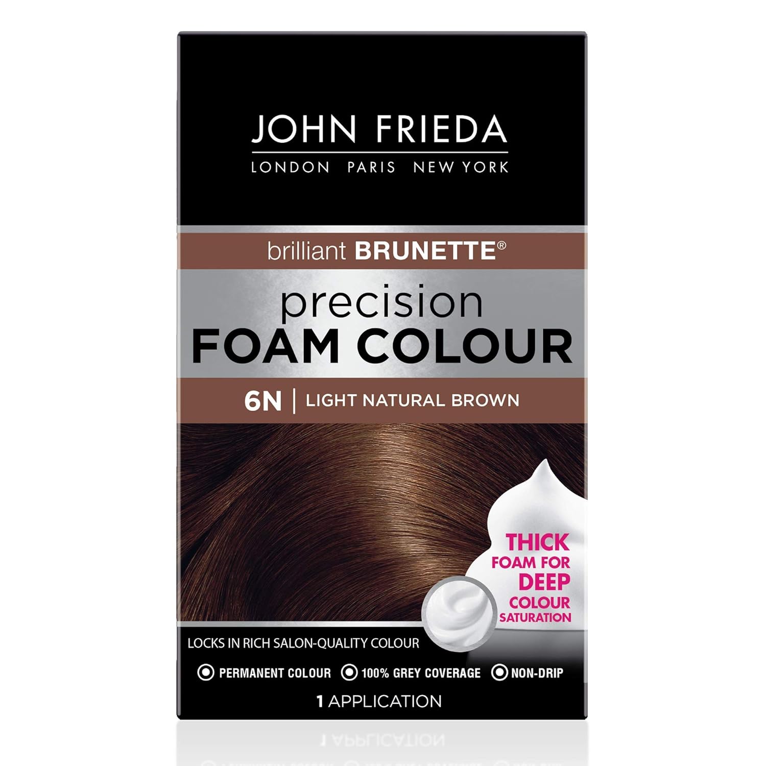 John Frieda Precision Foam Colour, Light Natural Brown 6N, Full-Coverage Hair Color Kit, Anti-Fade Gray Coverage, Deep Color Saturation Hair Dye, 1 Application