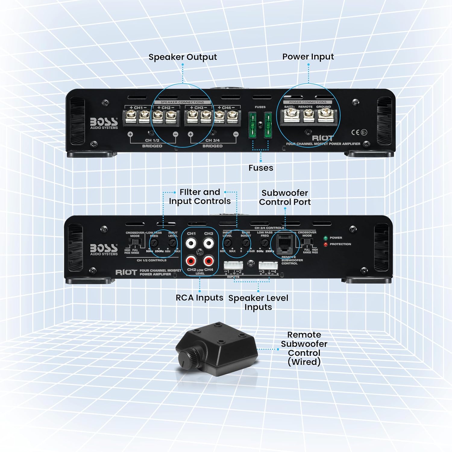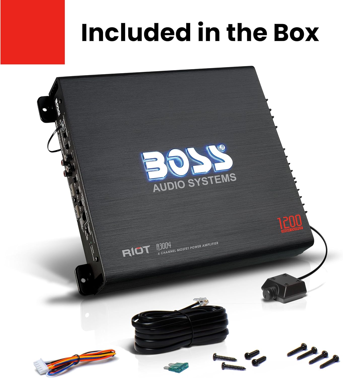 Get your music pumping with the Boss Audio Riot R3004 Class A/B 4-Channel Full Range Amplifier. This 2-Ohm stable Amplifier features 1200 Watts Max Power with a MOSFET power supply to maximize your music. Customize the sound with Variable Low Pass Crossover, High Pass Crossover and Bass Boost. Tweak the Bass with the Remote Subwoofer Control. Bridge channels for more power and flexibility. Amplifiers in the Riot Series are perfect for first time car audio buyers looking to add Bass, enhanced sound and performance to their system at an affordable price. Pump up the volume with the Boss Audio R3004. For further product details, please scroll down.