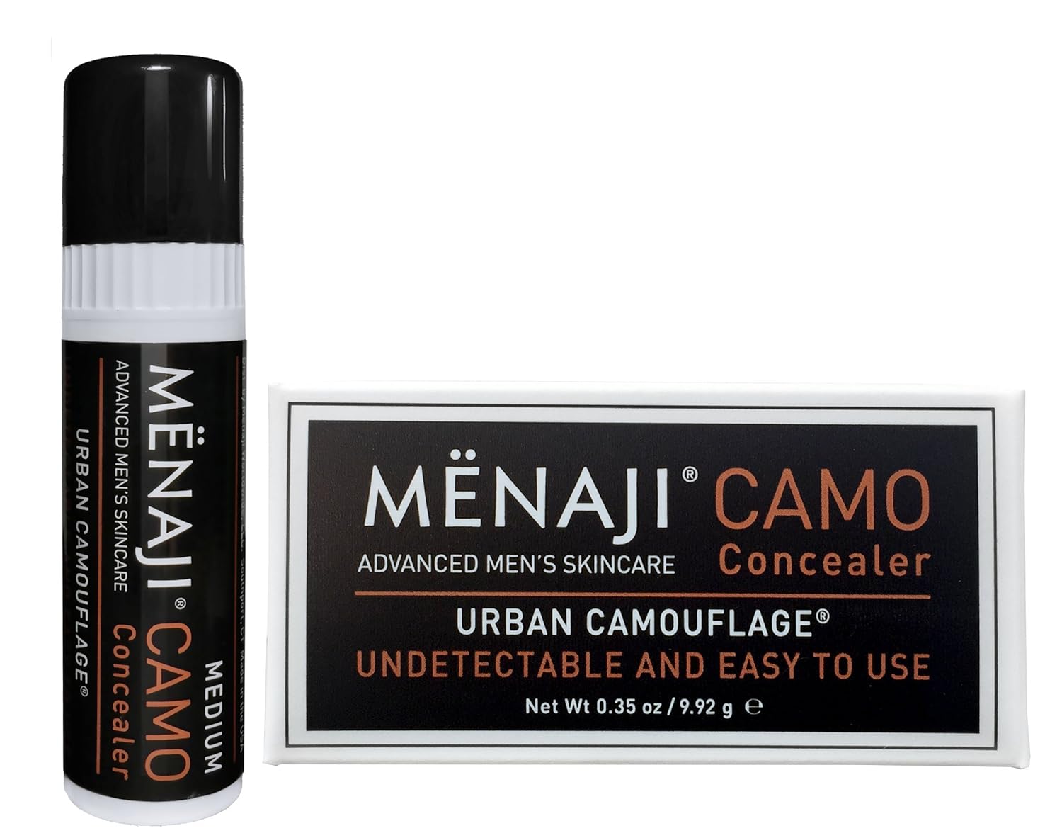UNDETECTABLE COVERAGE: MËNAJI CAMO Concealer is a men's cosmetic product intentionally designed to provide natural-looking coverage. Seamlessly blends into skin, effectively concealing blemishes, dark circles, and imperfections without leaving heavy or artificial finish. Enhances appearance while maintaining a natural, undetectable look. CAMO concealer comes in a chapstick looking tube, making it even more "undetectable".
