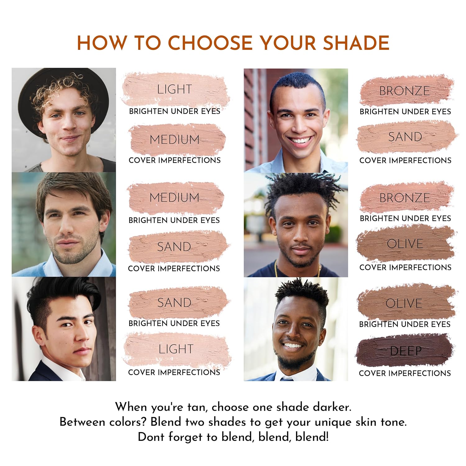 HOW TO CHOOSE A SHADE: For best results see our "How to Choose a Shade" image in the image carousel. MËNAJI has a total of 6 shades ranging from Light, Sand, Medium, Bronze, Olive, and Deep. (See shade tones in the images) No shade will be a perfect match, but with proper blending techniques, a close match will blend onto your skin for an undetectable look. If you need more assistance choosing a shade please contact the MËNAJI team.