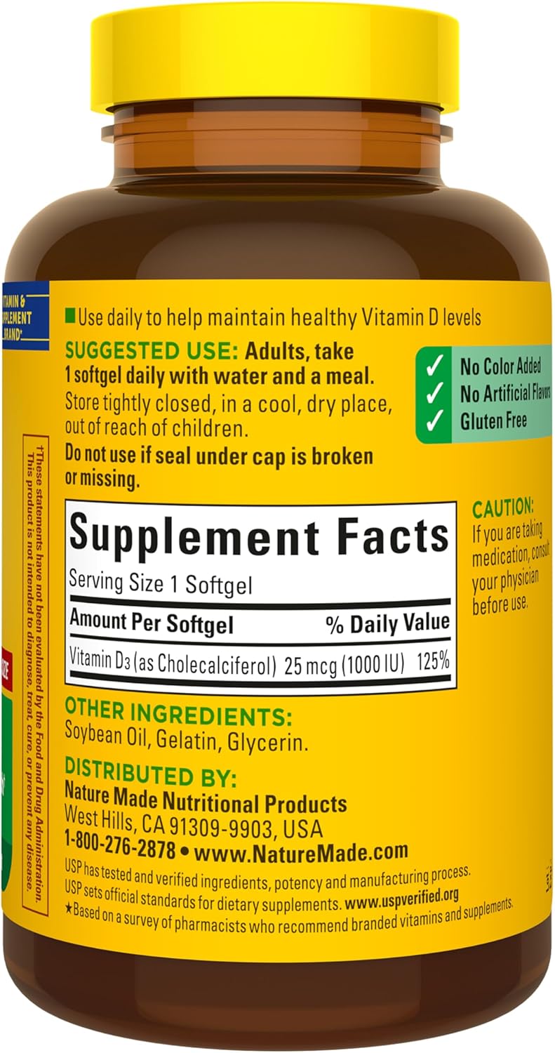 Nature Made Vitamin D3 1000 UI (25 mcg), Suplemento Dietético para Apoyar la Salud de Huesos, Dientes, Músculos y Sistema Inmunológico, 300 Cápsulas Blandas, Suministro para 300 Días