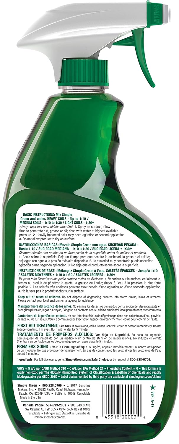 Simple Green Industrial Cleaner and Degreaser provides a safer alternative to caustic or acidic cleaners, bleaches and solvents. The trusted formula is non-abrasive and recognized by the U.S. EPA's Safer Choice Program. Designed to be used on all washable surfaces, Simple Green powers away heavy dirt, grease, food residue and stains from countertops, sinks, tile, carpet, flooring, upholstery and more. The cost-effective concentrate can be used manually or in cleaning equipment such as such as floor scrubbers, dip tanks, carpet extractors, pressure washers, steam extractors and foamers. Easily cuts through tough grease, oils, cutting fluids, and built-up grime on equipment, engines, machinery, vehicles and manufactured parts making it ideal for a wide range of industries including janitorial, manufacturing, MRO, food processing, mining, automotive, transportation and engineering.
