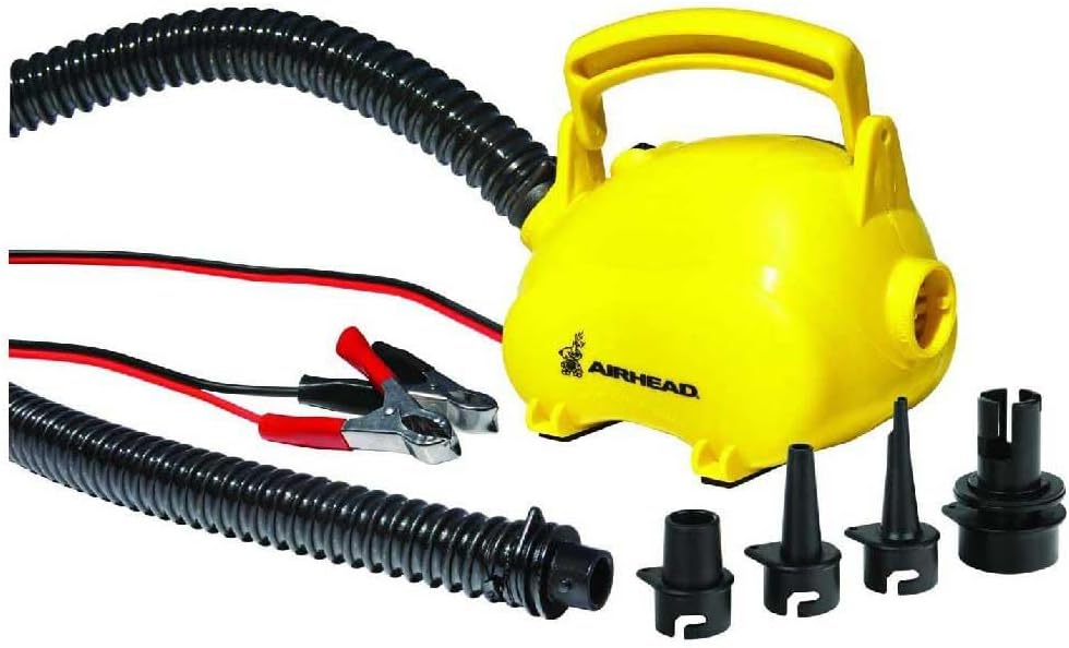 AIRHEAD AIR PIG 120v PUMP -This pump is called AIRHEAD AIR PIG to extol its high volume, high pressure capabilities. (It also happens to be shaped like a piggy bank.) The quiet motor puts out 2.2psi, plenty of pressure for most inflatables, including towable, boats, lounges and pool toys. Equipped with a 10' power cord with AC plug and a 24" reinforced hose. Four adapters for the most popular air valves are included. Draws 3.5 amps/470 watts.