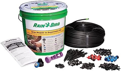 Rain Bird DRIPPAILQ Drip Irrigation Repair and Expansion Kit. This convenient and portable storage dispenser kit contains all of the parts and tools commonly needed to repair and expand a Drip irrigation system. Contains 112 professional grade universal Drip irrigation parts such as: emitters, tees, couplings, plugs, stakes, and a 1/4” faucet adapter. Stored beneath the removable top tray is a 250' roll of 1/4" distribution tubing. Intelligent design allows tubing to dispense through top tray; cut to length as needed while it always stays neatly rolled up…not loose and tangled. With this kit, you’re prepared to handle common maintenance projects such as: repairing tubing breaks, replacing a clogged emitter, adjusting flow for growing plants, or expanding coverage to adjacent planting beds. Includes 40 pressure compensating self-piercing emitters: (10) 0.5 GPH, (20) 1.0 GPH, and (10) 2.0 GPH. Rain Bird’s patented Emitter Installation and Removal Tool makes it easy to work with spot watering emitters as well as 1/4” barbed fittings. Trouble shooting guide provides tips on system maintenance, suggesting where common problems may occur and showing how to correct them by adjusting flow or fixing clogs and breaks. Rain Bird “The Intelligent Use of Water”
