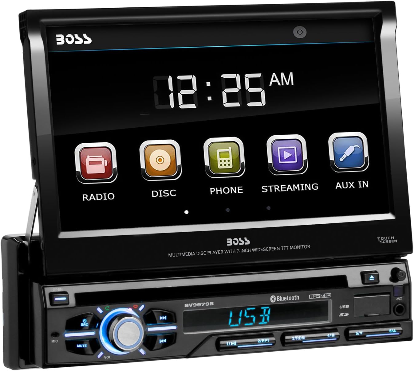 Reproductor de DVD para coche BOSS Audio Systems BV9979B, DIN único, audio Bluetooth y llamadas con manos libres, iluminación multicolor, DVD, CD, MP3, USB, entrada auxiliar SD, receptor de radio AM/FM, pantalla táctil LCD de 7 pulgadas, negro