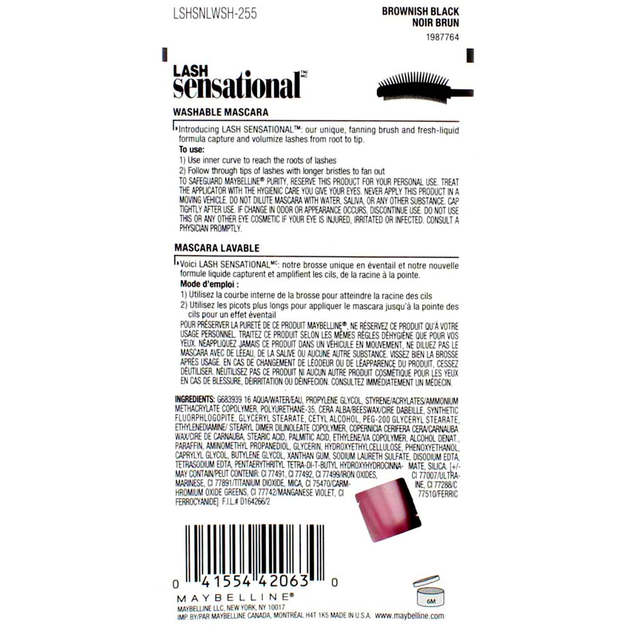 Descripción del producto ¿Sabías que tus pestañas crecen en más de una sola capa? El Mascara Lash Sensational despliega capa tras capa de pestañas para el nuevo efecto de abanico completo. Por qué te encantará: el primer mascara de efecto abanico completo de Maybelline New York. Nuestra primera brocha patentada de abanico con 10 capas de cerdas revela un completo despliegue de pestañas. Y, la fórmula de tinta líquida se aplica por todos lados. El mascara es como un cepillo de dientes: debes reemplazarlo cada tres meses. Esto asegura un rendimiento óptimo y reduce el riesgo de infección causado por la acumulación de bacterias. Usando un removedor de maquillaje para ojos adecuado, asegúrate de quitar todo el mascara antes de ir a dormir. Esto mantiene las pestañas saludables y fuertes y previene el rompimiento. Instrucciones Usa la curva interna para llegar a las raíces de las pestañas. Barrúa de la raíz hasta la punta de las pestañas. No dejes que el mascara alargador se seque entre capas. Retira fácilmente el mascara alargador con el Removedor de Maquillaje Expert Eyes 100% Libre de Aceite de Maybelline. Advertencias Advertencia de seguridad: Para salvaguardar la pureza, reserva este producto para uso personal. Trata el aplicador con el cuidado higiénico que das a tus ojos. Nunca apliques este producto en un vehículo en movimiento. No diluyas con agua, saliva o cualquier otra sustancia. Cierra bien la tapa después de usar. Si ocurre un cambio en el olor o apariencia, descontinúa el uso. No uses este o cualquier otro cosmético si tu ojo está lesionado, irritado o infectado. Consulta a un médico con prontitud.