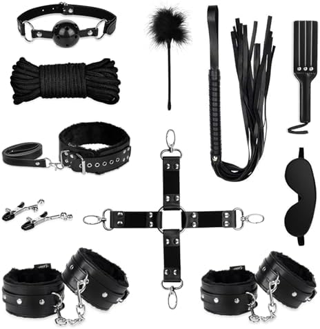 Contenido: 1. Un par de esposas. 2. Un par de grilletes. 3. Un par de pinzas para los pezones. 4. Una látigo. 5. Una cuerda. 6. Una bozal. 7. Un plumaje. 8. Un collar. 9. Una correa cruzada. 10. Una venda para los ojos. 11. Una paleta.