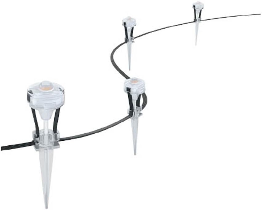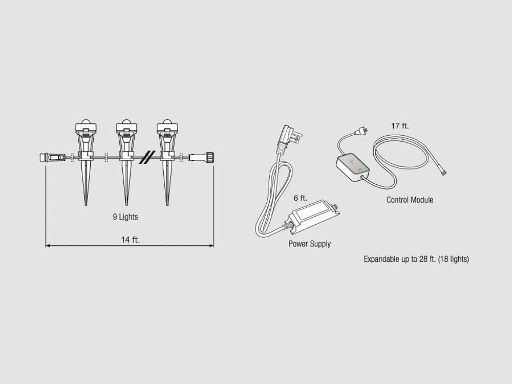 Wet rated for outdoor use: Starter Kit contains power supply, control module and 9 Gardenspot lights for up to 14 feet of total coverage; Maximum suggested length is 28 total feet (via extension kits, sold speratately); Removable stakes for mounting on decks, siding, etc
