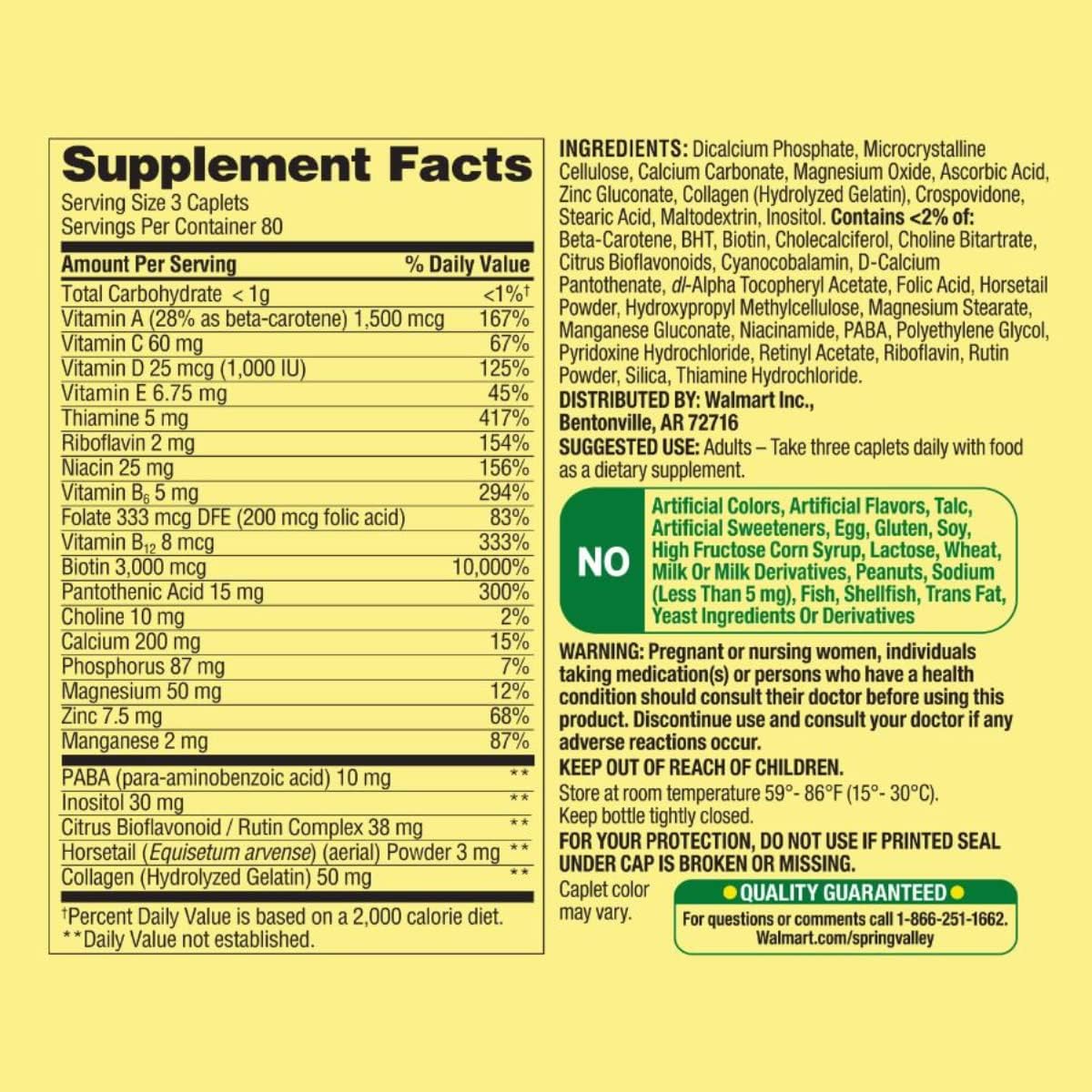 Spring Valley - Cabello, Piel y Uñas, Más de 20 Ingredientes Incluyendo Biotina y Colágeno, 240 Cápsulas