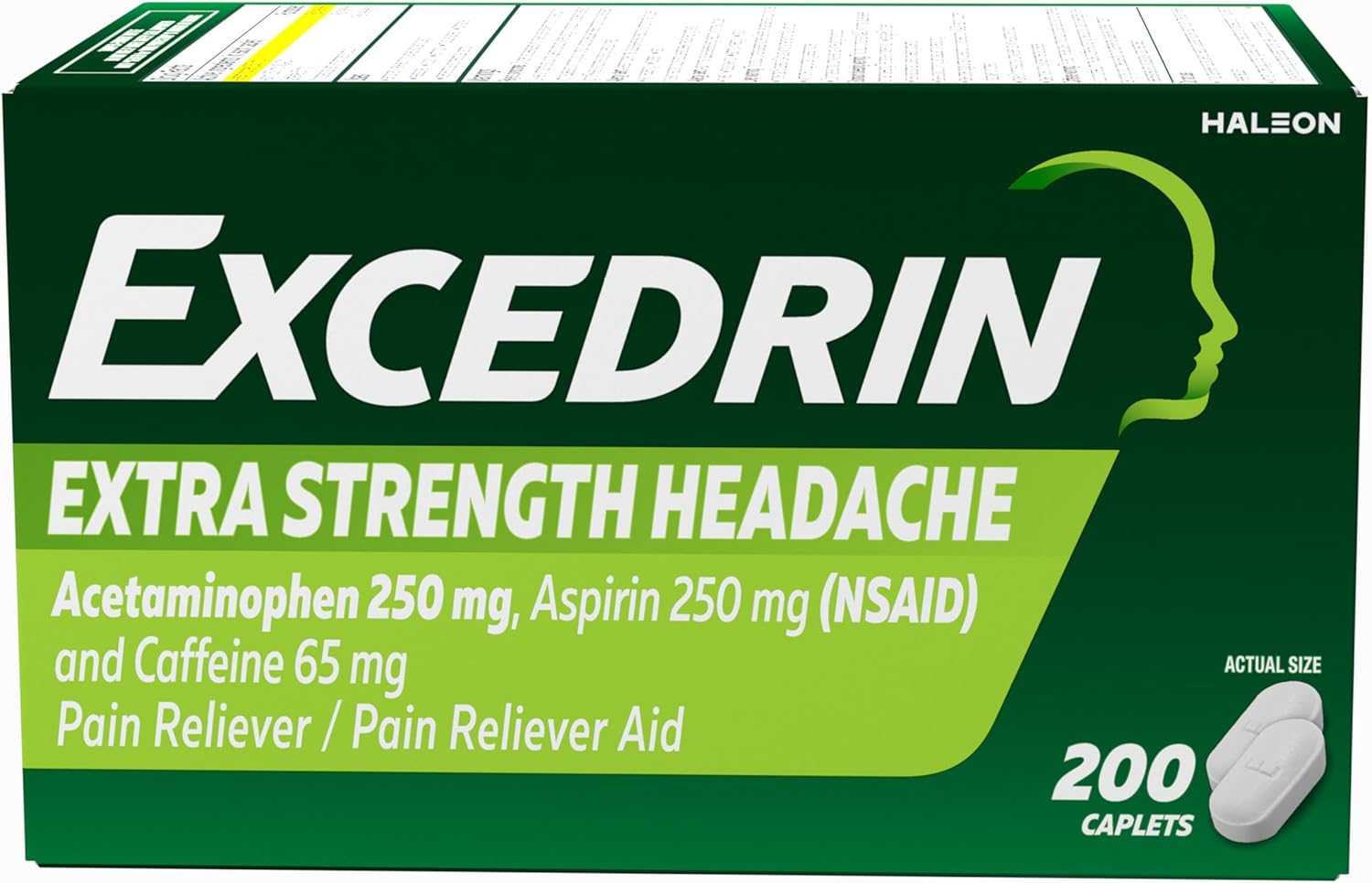 Excedrin Extra Strength Pain Relief Caplets para Alivio de Dolores de Cabeza, Acetaminopheno 500mg, Aspirina 250mg, Cafeína 65mg, Analgésico, 200 Unidades
