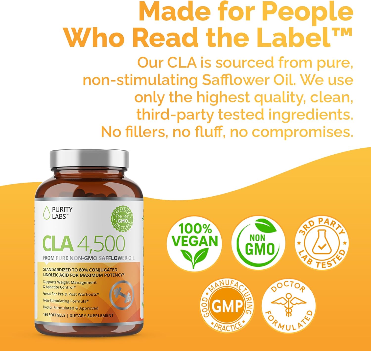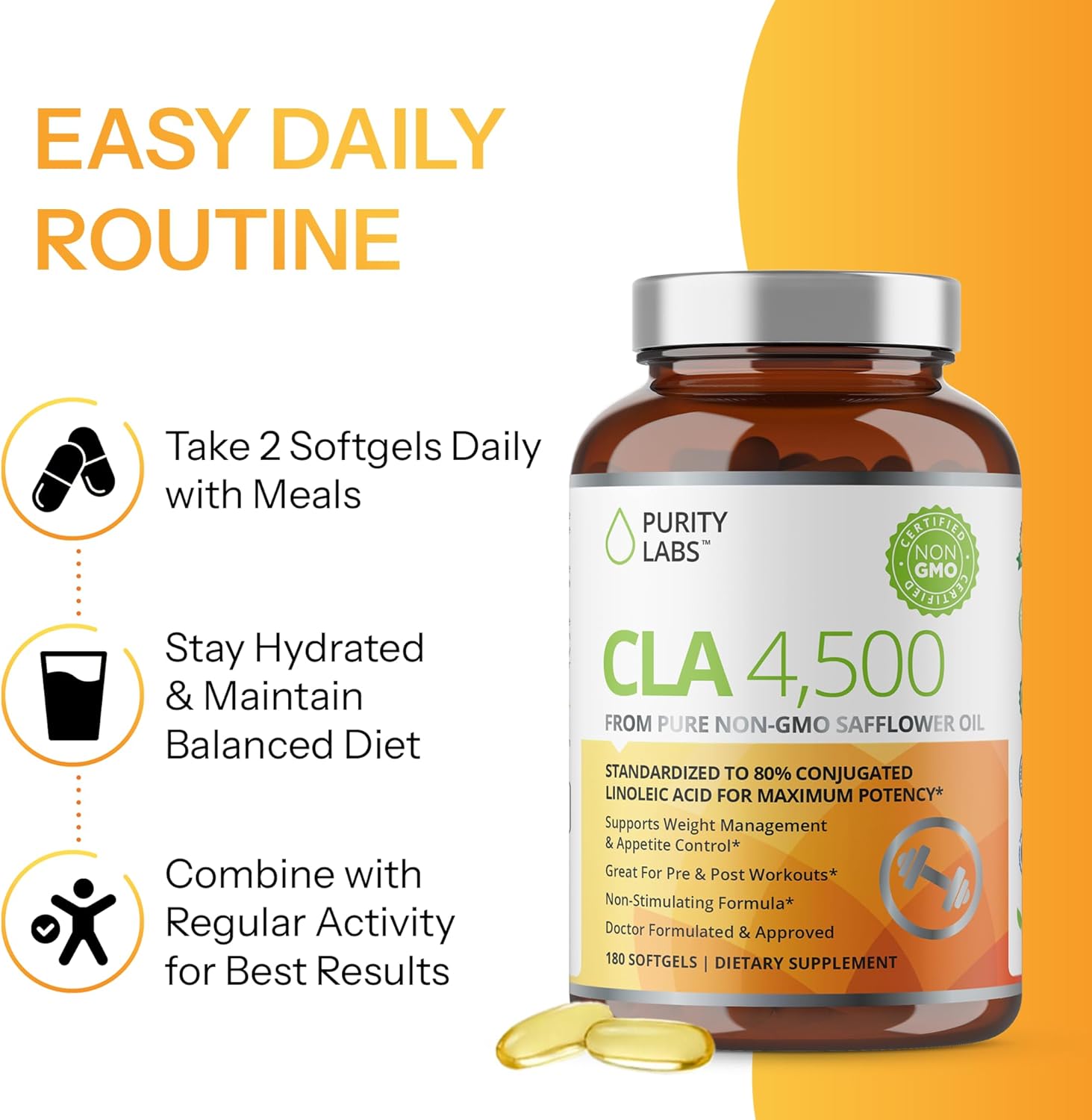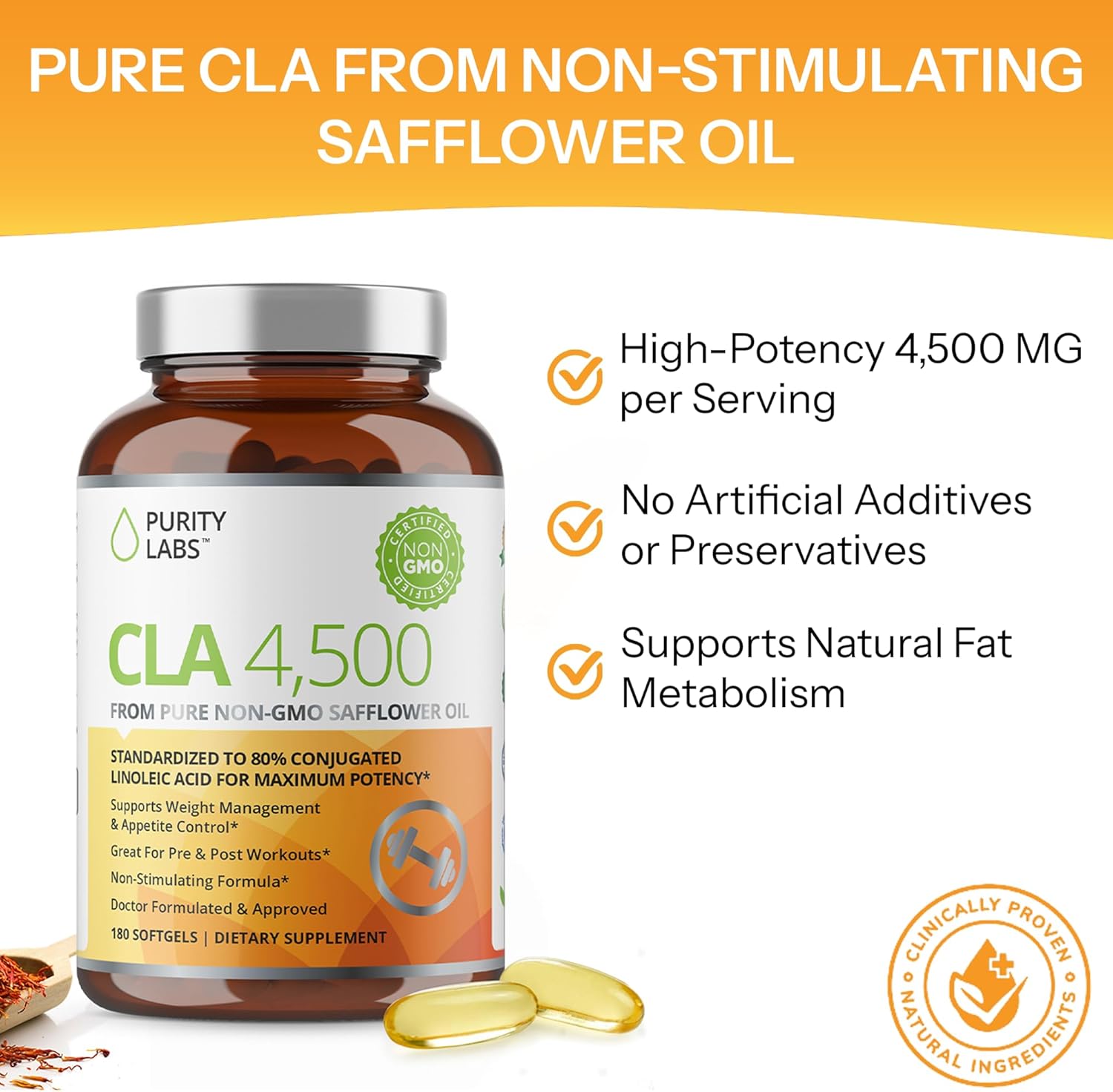 Purity Labs CLA Supplements 4500MG - Non-GMO Safflower Oil - Supports Energy, Weight Loss, Heart Health, and Muscle Health - 180 Soft gels