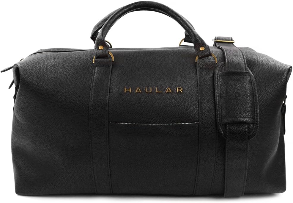 The Haular weekender bag is hand-crafted with the finest quality bonded PU leather, super soft faux leather and vintage brass materials. It features a wide, comfy strap with a cushioned shoulder pad to make carrying your things as effortless as possible. Five metal studs on the base of the bag protect it and your items from wet or dirty surfaces and ensure everything is kept in pristine condition. With a total of 7 pockets throughout the weekender you can keep all of your personal items together in one place. There are three spacious interior pockets and 2 outside pockets that are perfect for keeping your passport, currency, boarding passes, mobile phone and general essentials. The two shoe compartments are also ideal for keeping all of your things organised and tidy. The Haular weekend bag complies with all airline hand luggage size restrictions which means you can take it straight onto your flight without having to worry about check-in or suitcase costs. Key Features: - Smooth, high-quality PU leather - Adjustable strap buckles - Strong, brass riveted strap and handles - Water resistant coating - Dimensions; 51 x 32 x 23cm- Capacity; 38 liters - Haular Lifetime Guarantee