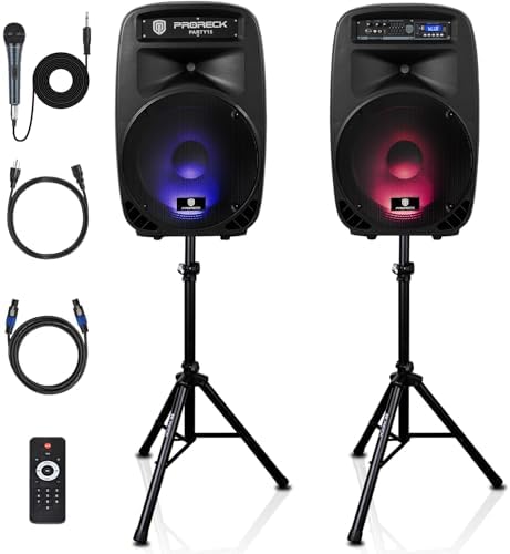 PRORECK Party 15 Juego de altavoces PA portátiles de 15 pulgadas y 2000 vatios de 2 vías con Bluetooth/USB/lector de tarjetas SD/radio FM/control remoto/luz LED